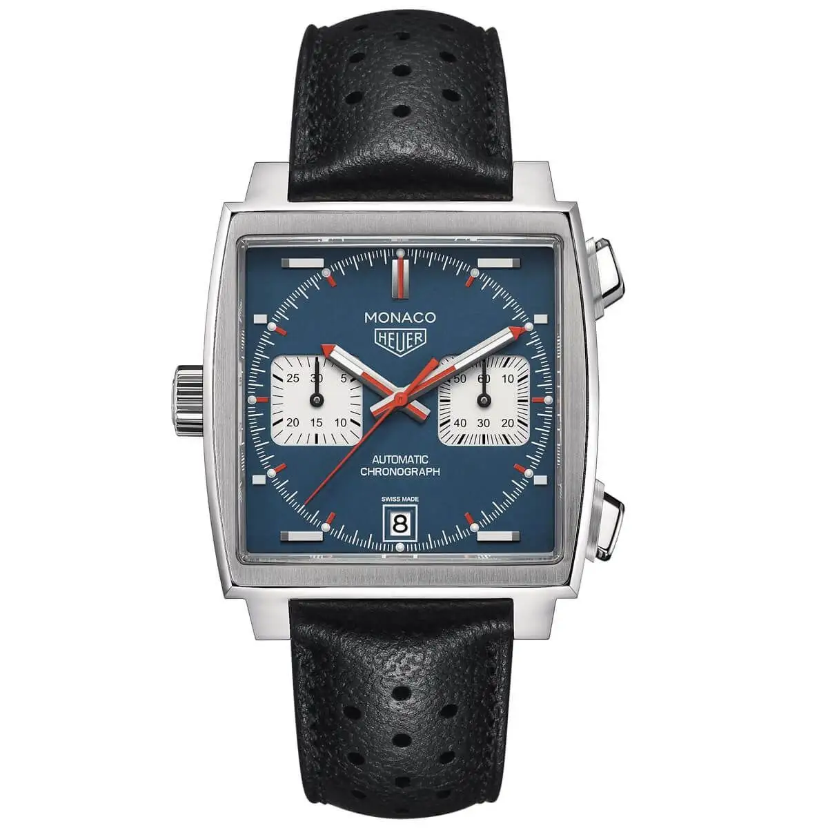 Pasek wykonano z naturalnej skóry w kolorze czarnym, z charakterystycznymi otworami typu rally. Takie rozwiązanie nie jest wyłącznie estetyczne. Otwory poprawiają wentylację nadgarstka i nawiązują do klasycznych pasków wyścigowych stosowanych w zegarkach inspirowanych motoryzacją. Faktura skóry jest wyczuwalna w dotyku i dobrze komponuje się ze sportowym charakterem modelu Monaco.