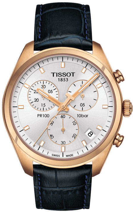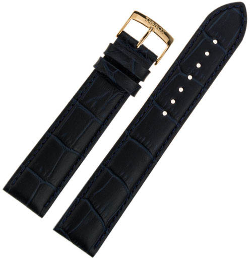 Oryginalny pasek do zegarków męskich Tissot PR 100 Chronograph. Wykonany ze skóry naturalnej Tissot T600037058 w kolorze niebieskim. Przeznaczony do zegarków Tissot PR 100 z numerem serwisowym na deklu T101417, ale również do innych modeli, do których można założyć pasek o szerokości 20 mm. Klamerka wykonana ze stali szlachetnej w kolorze różowego złota posiada wyraźny napis Tissot.