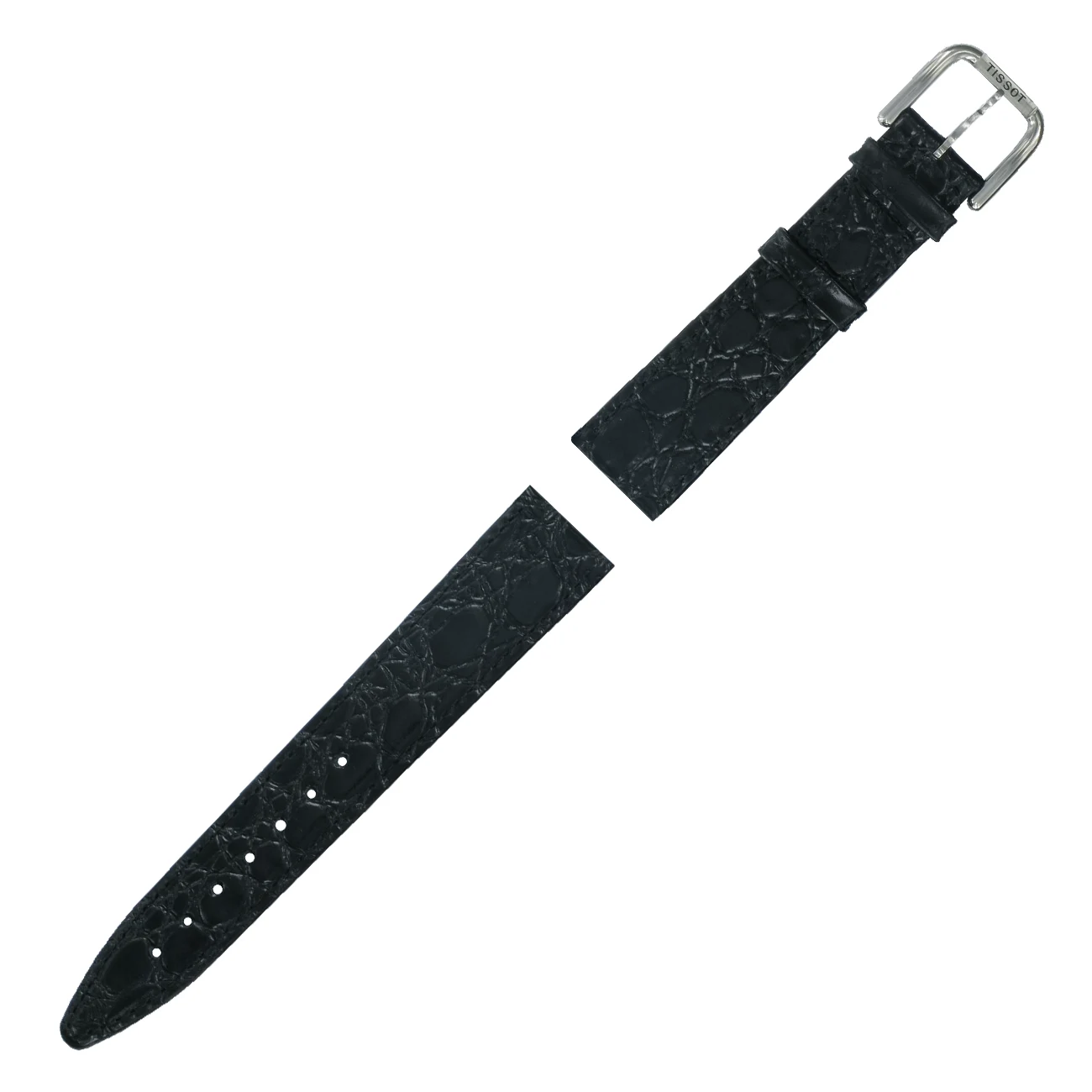 Tissot T600013307 czarny pasek skórzany 18 mm z tłoczeniem krokodyla. Wyposażony w stalową klamerkę z logotypem Tissot.