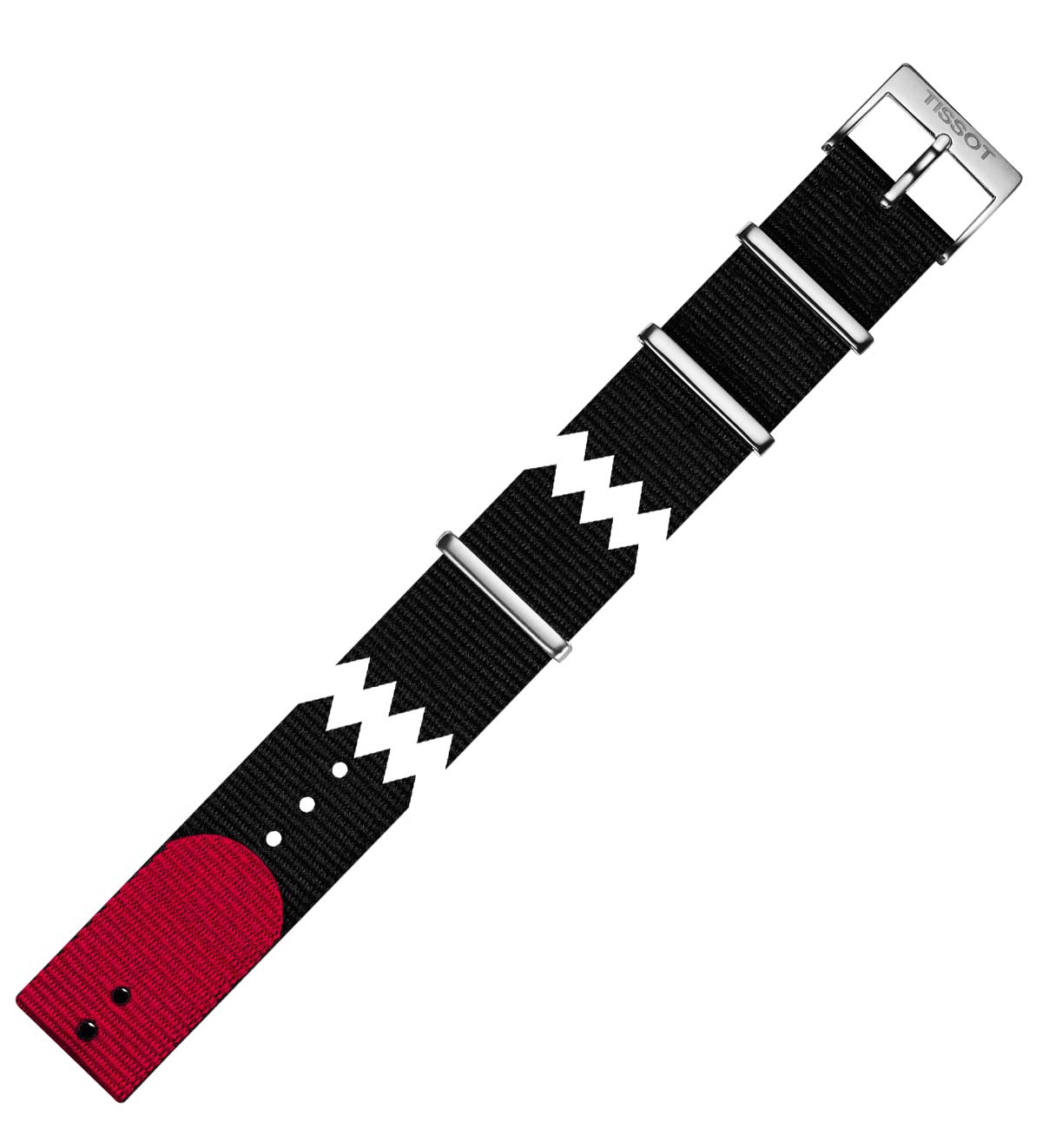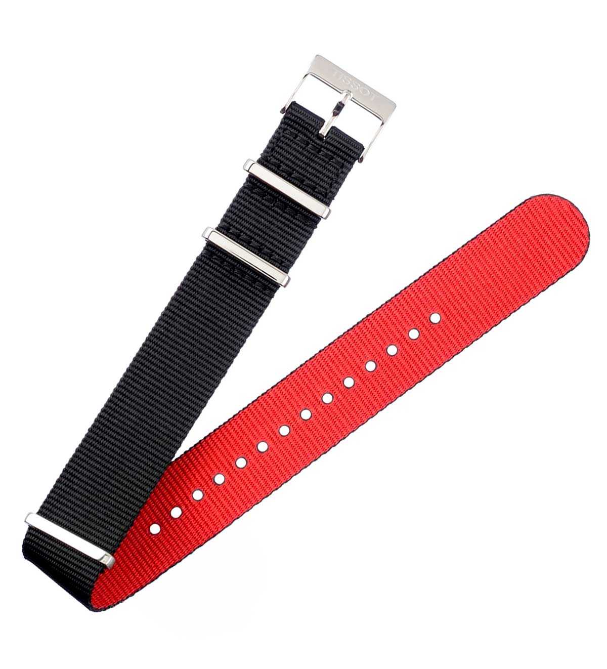 Oryginalny pasek do zegarka Tissot. Materiałowy Tissot T604039643 w stylu NATO w kolorze czarnym z czerwonym spodem. Dedykowany do modelu Everytime z numerem na deklu T109410, ale również do innych zegarków, do których można założyć pasek o szerokości 19 mm. Klamerka wykonana ze stali szlachetnej. Długość całkowita 265 mm.