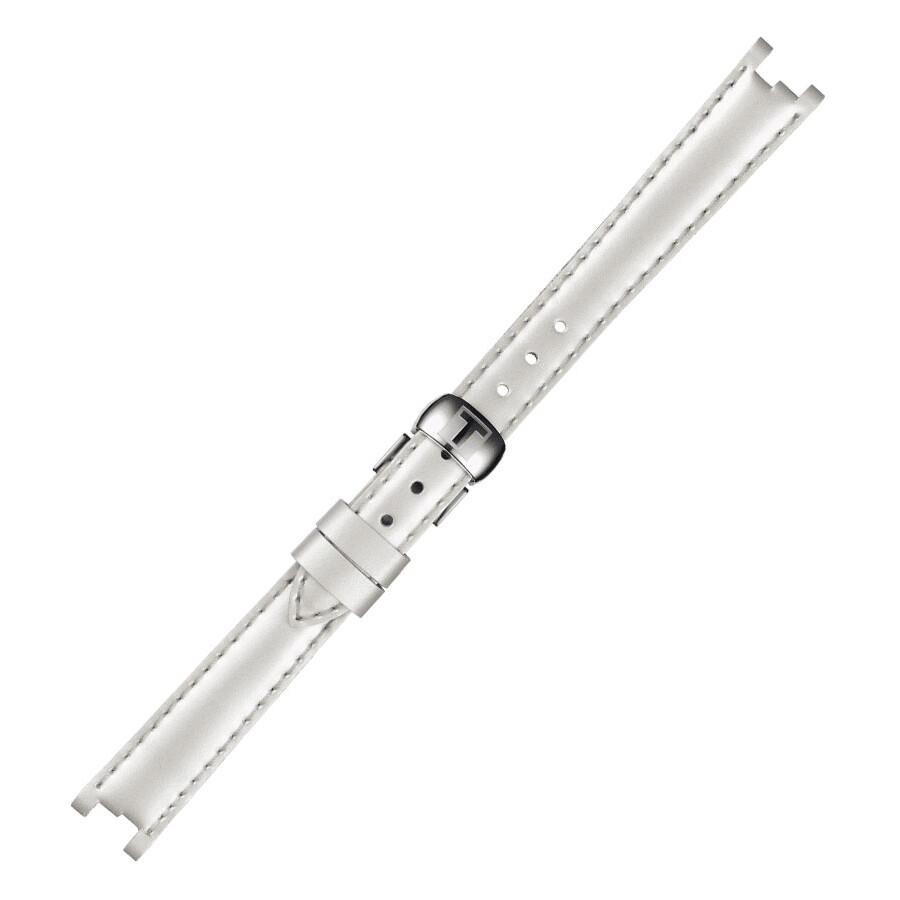 Oryginalny pasek T852.036.540 o szerokości 12 mm do zegarków damskich Tissot Flamingo o numerze serwisowym na deklu T094.210. Wykonany ze skóry bydlęcej w kolorze białym. Pasek wyposażono w bezpieczne, stalowe zapięcie motylkowe otwierane za pomocą przycisków.
