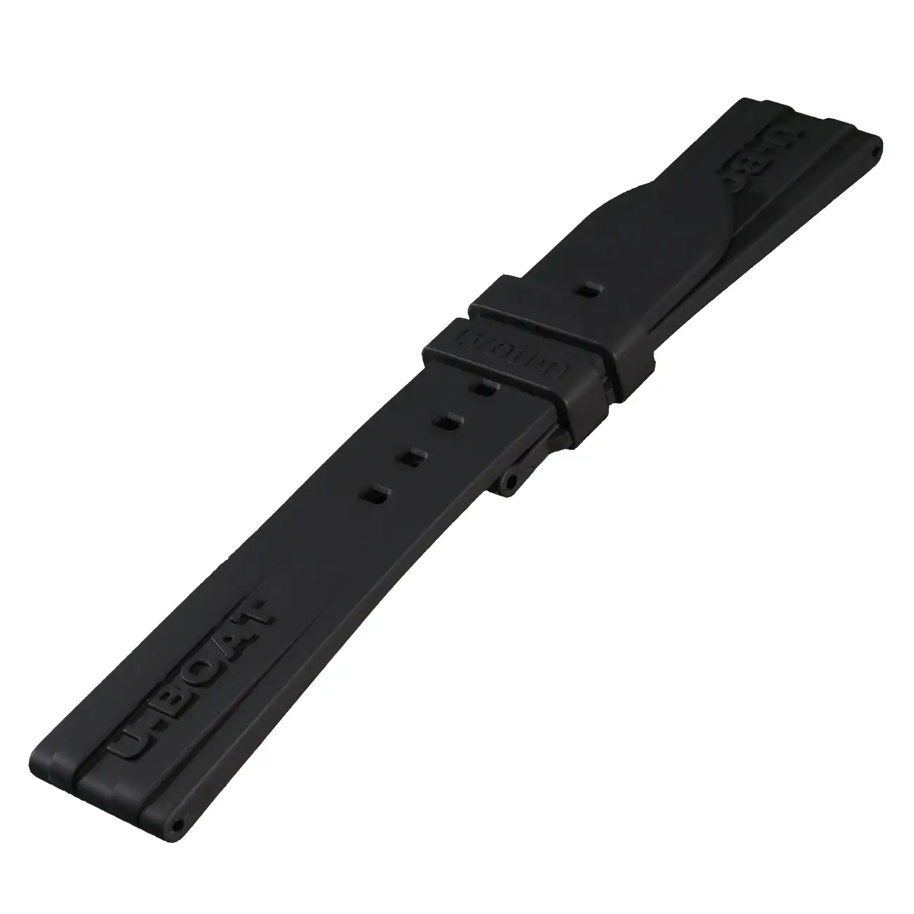 Pasek o szerokości 23 mm zaprojektowano z myślą o pełnej kompatybilności z charakterystyczną kopertą modeli Darkmoon i Capsoil. Tłoczone logo U-BOAT wzdłuż zewnętrznej powierzchni podkreśla industrialny, mocny styl kolekcji. Materiał jest elastyczny i odporny na działanie wody, potu oraz promieniowania UV, co czyni ten pasek idealnym wyborem dla użytkowników poszukujących połączenia funkcjonalności i charakterystycznej estetyki marki.