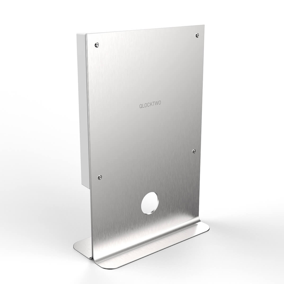 Podstawka, stojak Qlocktwo dedykowany do wszystkich zegarów z serii EARTH 45, które do tej pory nadawały się wyłącznie do montażu na ścianie. Wykonany ze szczotkowanej stali nierdzewnej i wyposażony w biały wspornik, znacznie poszerza obecnie możliwości prezentacyjne, zwłaszcza kolekcji Earth Creator's Edition.