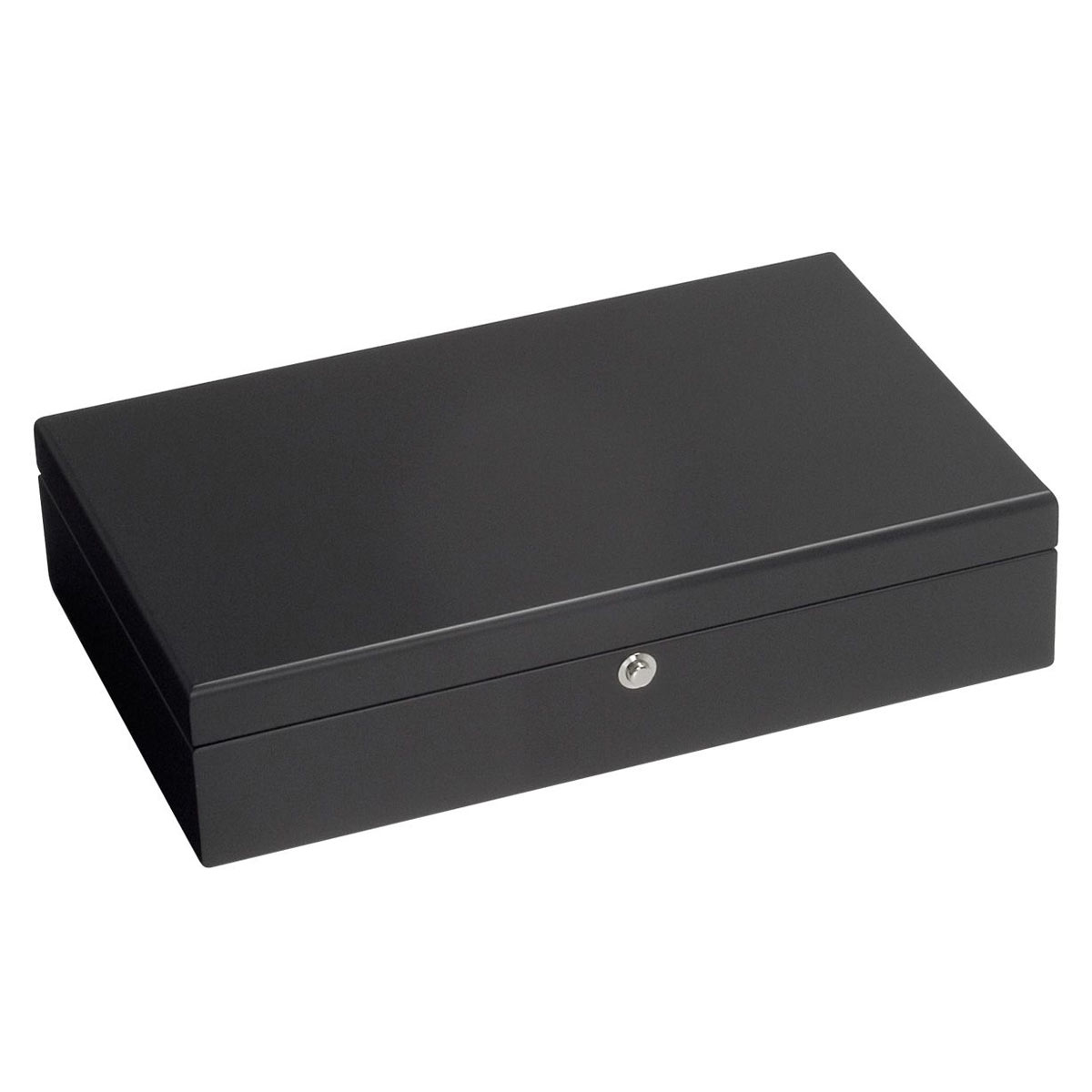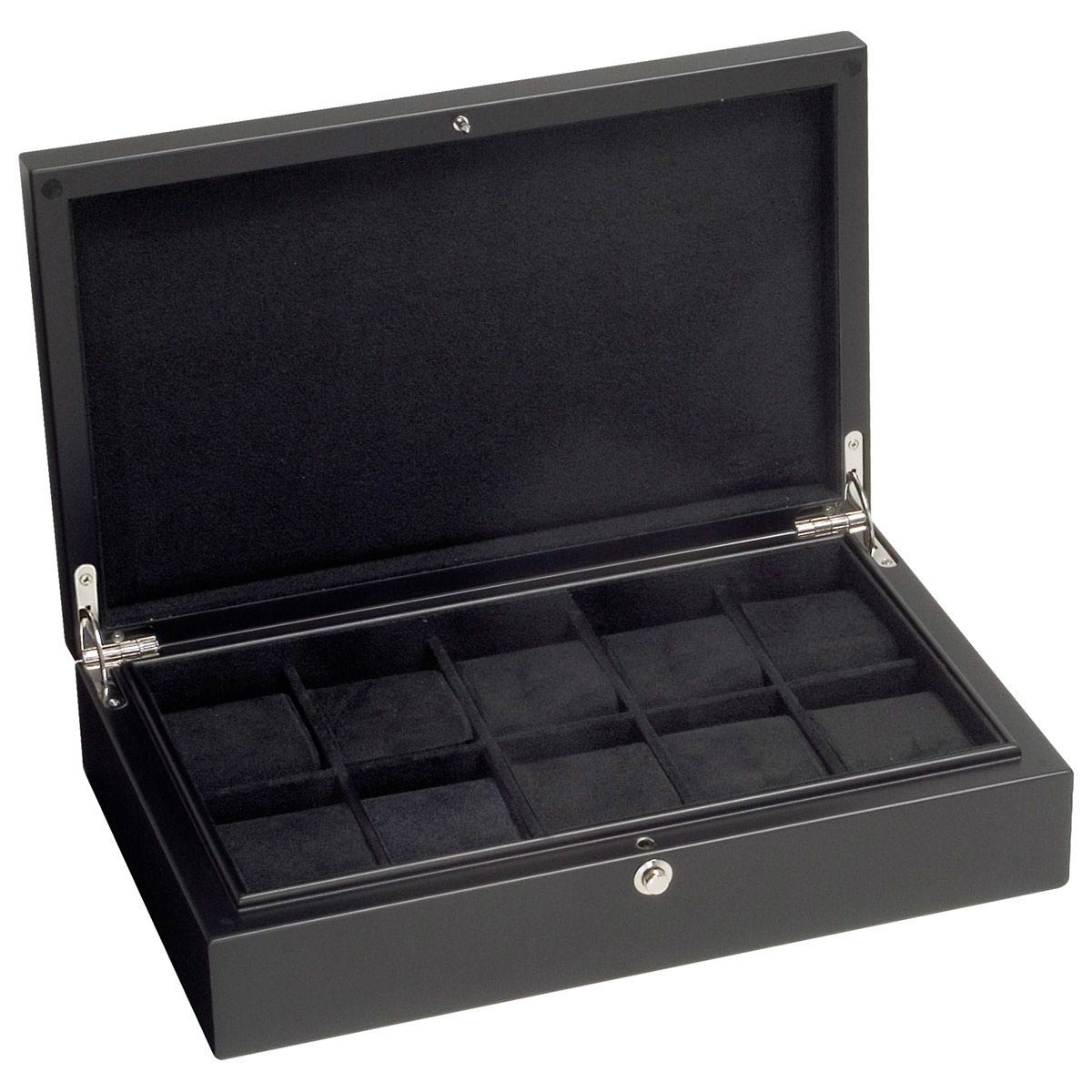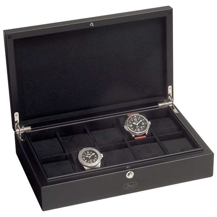 Eleganckie, wysokiej jakości pudełko na 10 zegarków, wykończone czarnym, matowym drewnem. Pudełko wykonane z dbałością o najmniejsze szczegóły, w środku wyłożone przyjaznym aksamitem. Nowoczesny i doskonały sposób na przechowywanie ulubionych zegarków, idealnie nadaje się na prezent. Elegancka forma w precyzyjnym wykonaniu.