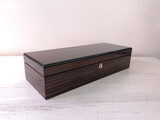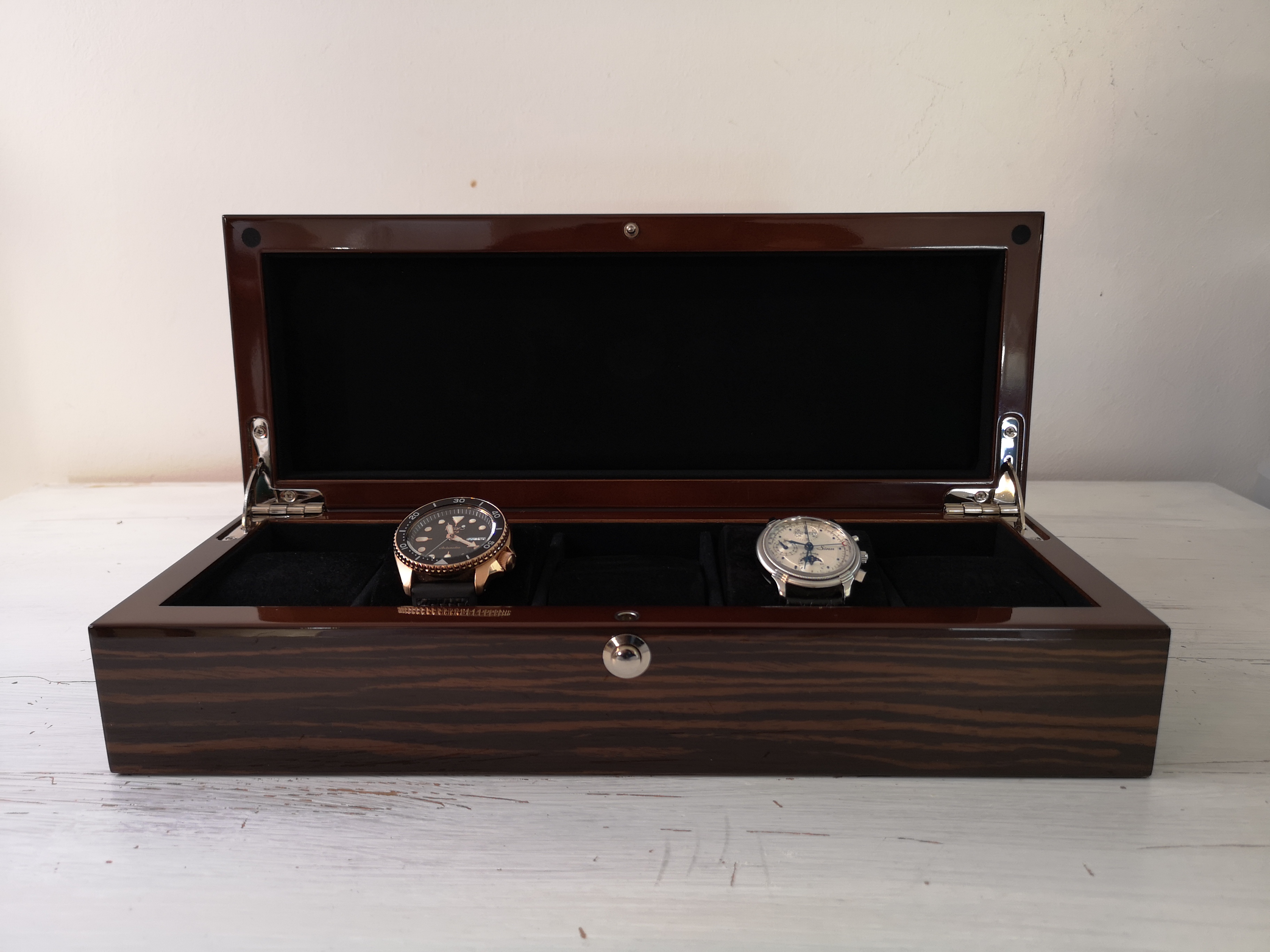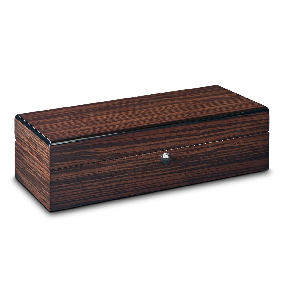 Eleganckie, wysokiej jakości pudełko na 5 zegarków. Wykonane z drewna Macassar w kolorze brązowym, polerowane na wysoki połysk. Pudełko wykonane z dbałością o najmniejsze szczegóły. W środku wyłożone miękkim i przyjemnym w dotyku materiałem. Nowoczesny i doskonały sposób na przechowywanie ulubionych zegarków, idealnie nadaje się na prezent. Elegancka forma w precyzyjnym wykonaniu.