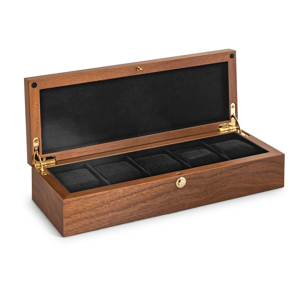 Eleganckie, wysokiej jakości pudełko na 5 zegarków Beco 309365. Wykonane z matowego drewna orzecha włoskiego z dbałością o najmniejsze szczegóły. W środku wyłożone miękkim i przyjemnym w dotyku materiałem. Nowoczesny i doskonały sposób na przechowywanie ulubionych zegarków, idealnie nadaje się na prezent. Elegancka forma w precyzyjnym wykonaniu.