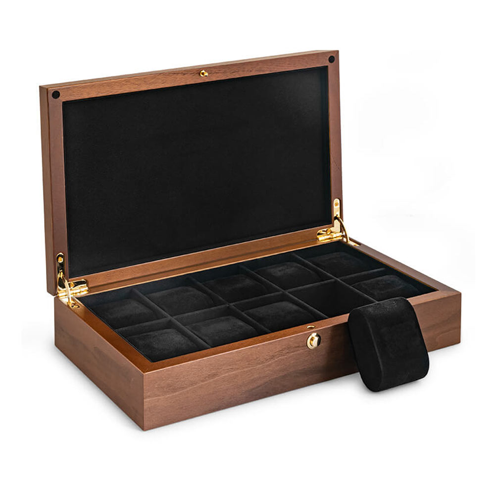 Eleganckie, wysokiej jakości pudełko na 10 zegarków Beco 309367. Wykonane z matowego drewna orzecha włoskiego z dbałością o najmniejsze szczegóły. W środku wyłożone miękkim i przyjemnym w dotyku materiałem. Nowoczesny i doskonały sposób na przechowywanie ulubionych zegarków, idealnie nadaje się na prezent. Elegancka forma w precyzyjnym wykonaniu.