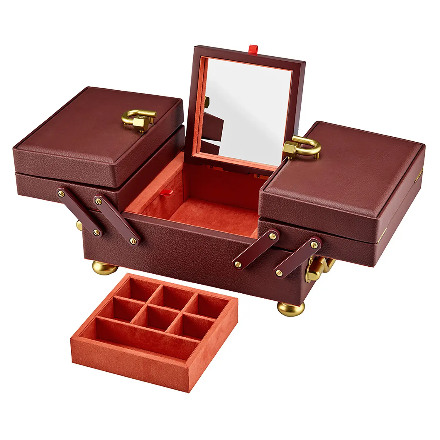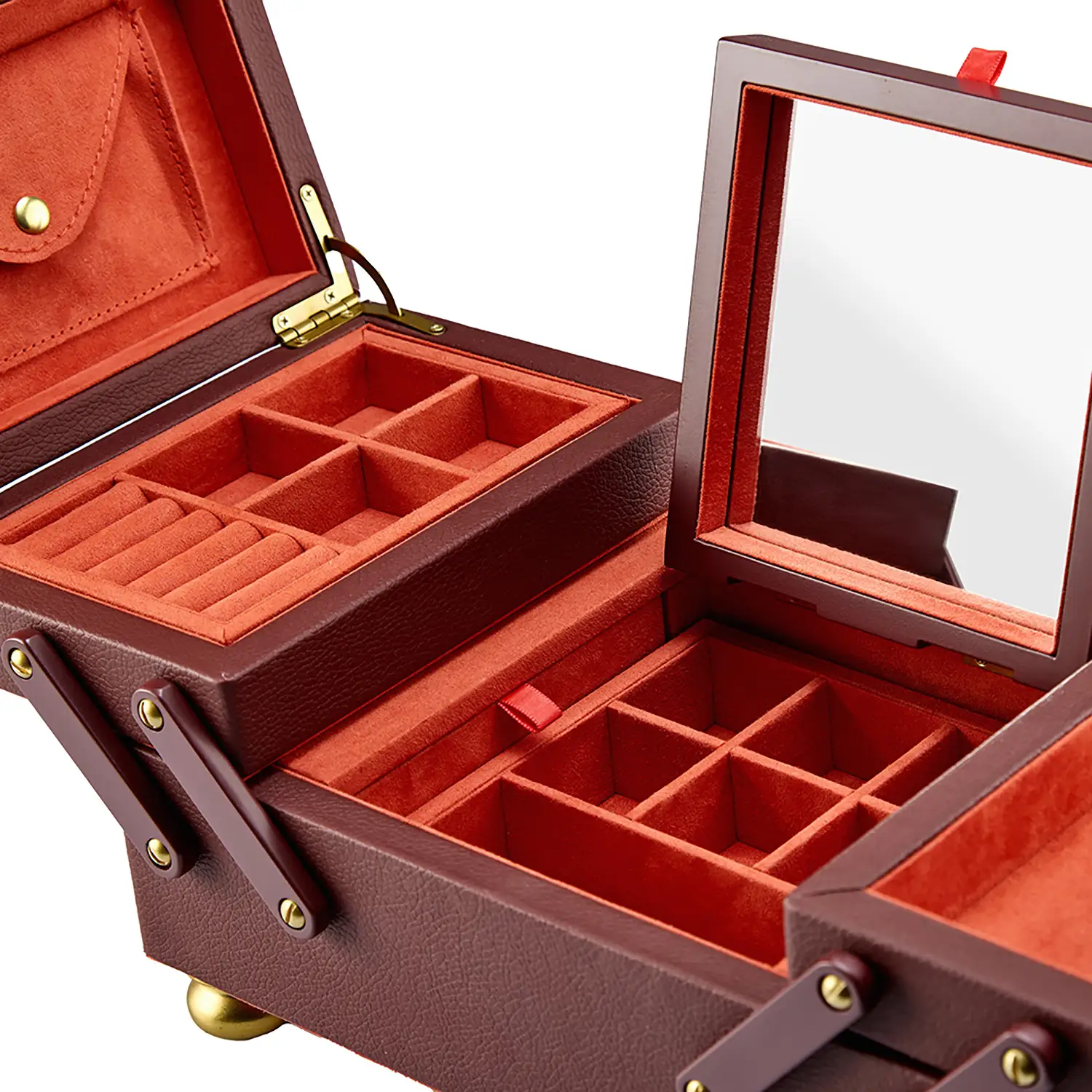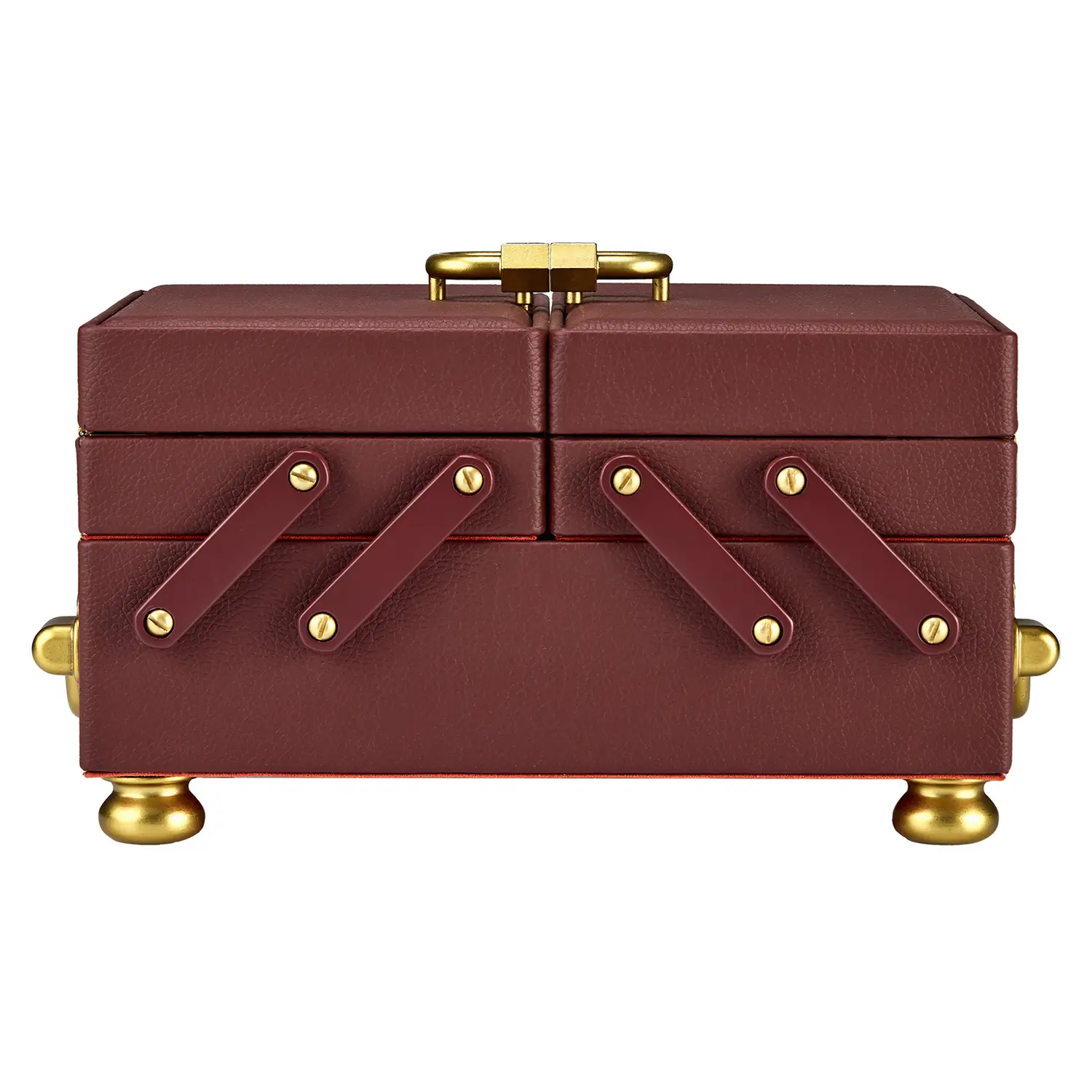 Model ten został wykonany z wegańskiej skóry w kolorze bordowym i zachwyca przemyślaną konstrukcją: od dwupoziomowego układu z wyjmowaną tacką, przez tajne schowki, po składane lusterko. Wnętrze wyściełane materiałem LusterLoc™ skutecznie chroni biżuterię przed matowieniem nawet przez 35 lat. Idealny wybór na prezent lub jako element eleganckiego wnętrza – funkcjonalny, dekoracyjny i niezwykle praktyczny.