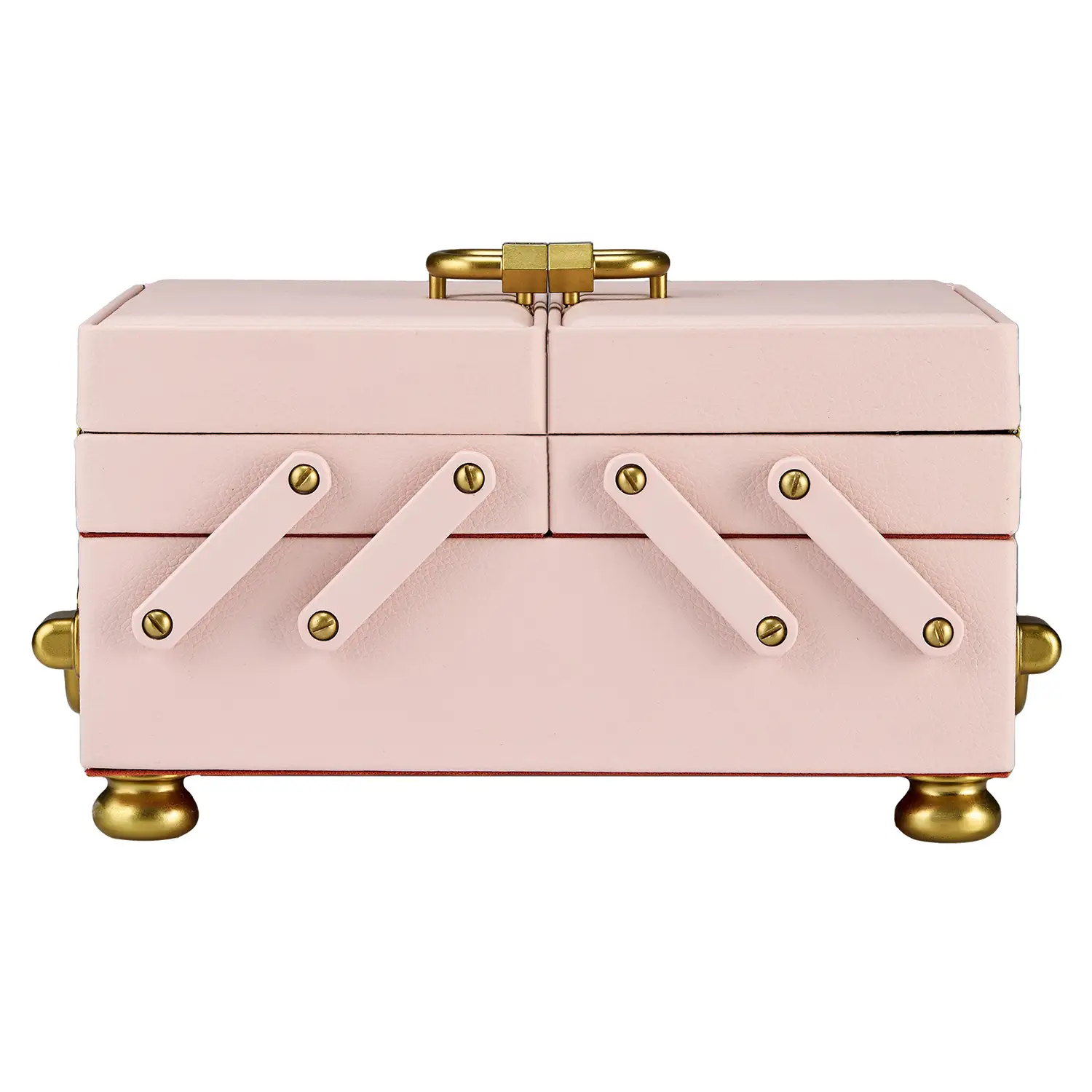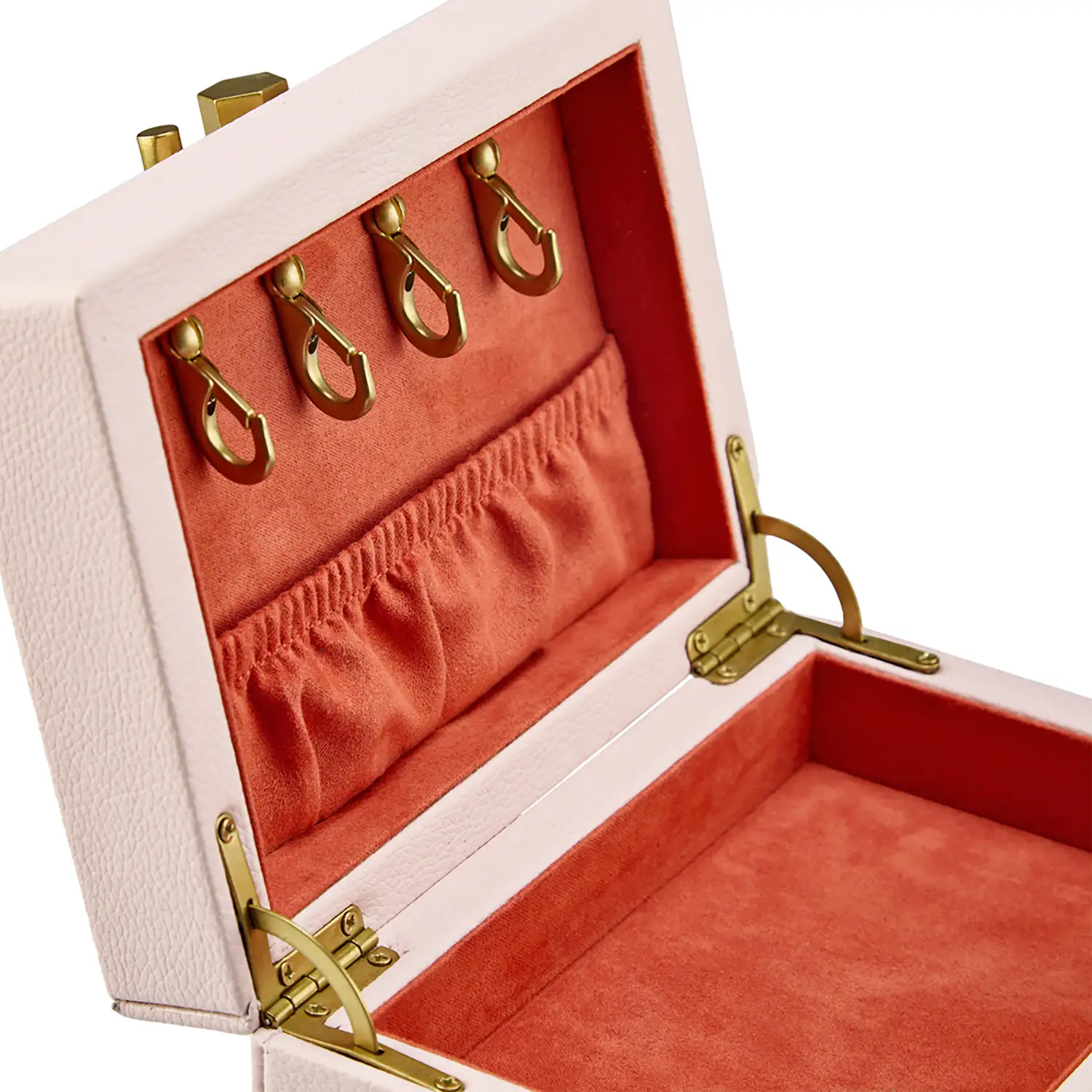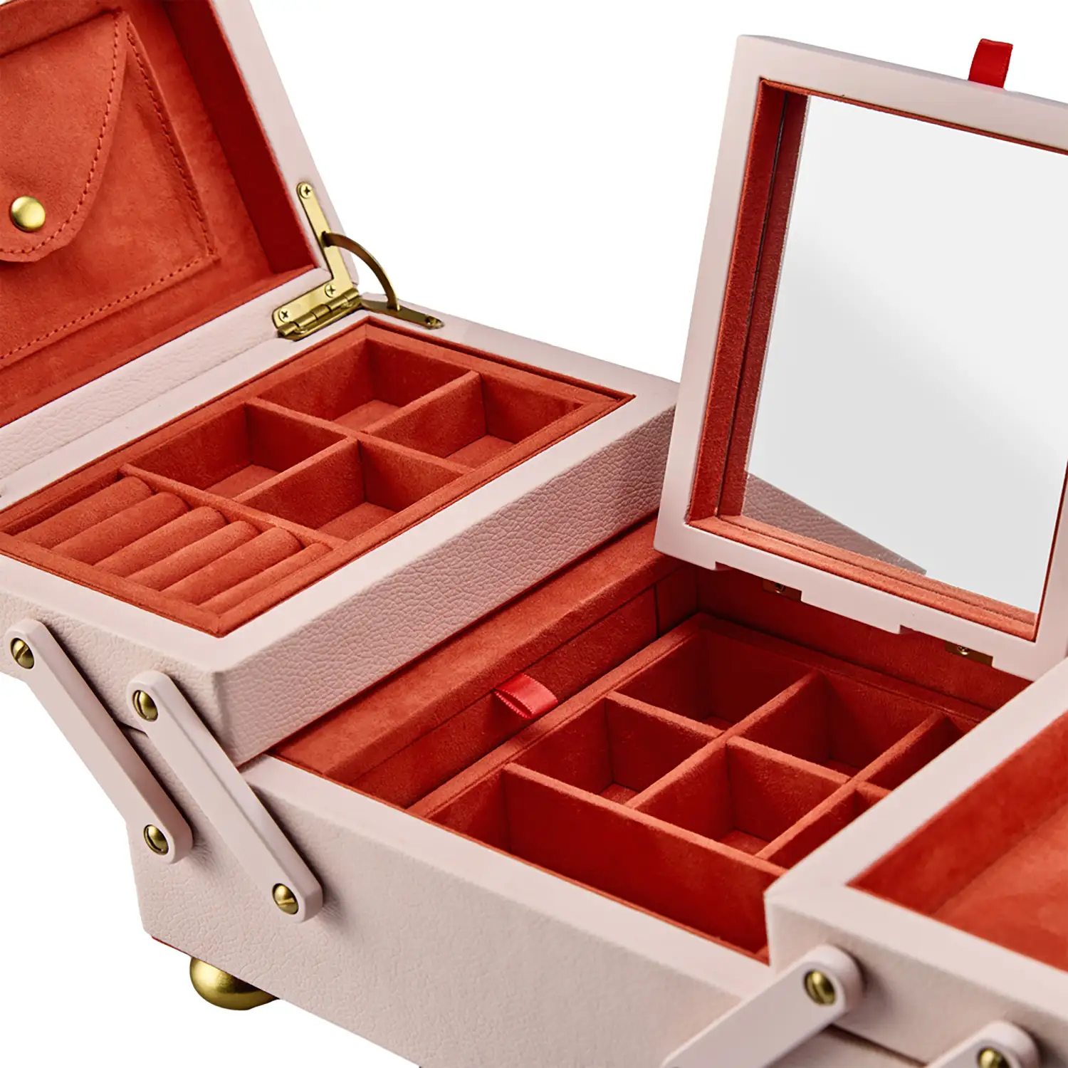 - Przechowywanie: 2 boczne uchwyty do pierścionków, 1 wyjmowana tacka z 4 wałkami na pierścionki i 4 przegrodami, 3 główne przestrzenie do przechowywania, 2 ukryte schowki, 4 haczyki na naszyjniki i kieszonka, 1 koperta do przechowywania, składane lusterko