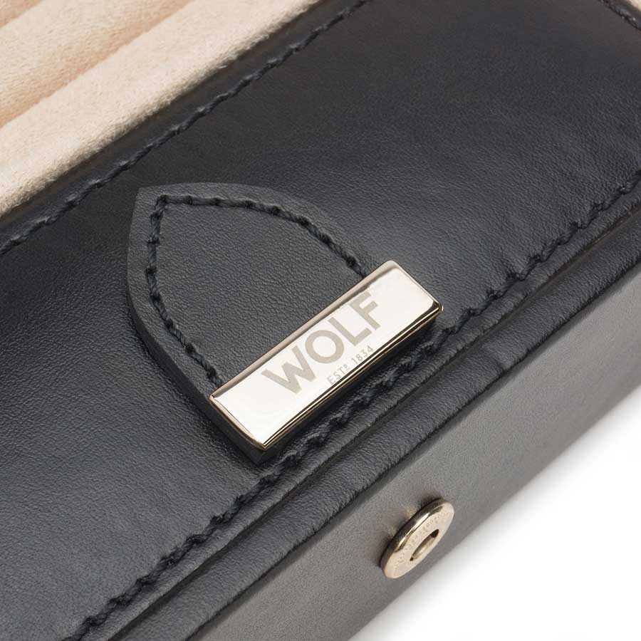 Wybierz się w podróż do egzotycznego i odurzającego miejsca, gdzie skóra i złocone ćwieki łączą się, tworząc orientalne wzory. Piękne pudełko na biżuterię WOLF Marrakesh 308402 w kolorze czarnym z 5 przegródkami i 3 rolkami na pierścionki. Kształt i wymiary 27,5 cm x 11,4 cm x 5 cm (długość, szerokość, wysokość) sprawiają, że ta szkatułka idealnie mieści się w większości sejfach lub może być wspaniałym kompanem w podróży. Wnętrze jest wyścielone specjalnym materiałem WOLF LusterLoc™ absorbującym gazy, które sprawiają, że biżuteria matowieje i ciemnieje. Tym samym zapewnia nienaganny wygląd biżuterii przez co najmniej 35 lat. Na klapie wewnątrz pudełka znajduje się również eleganckie lusterko.