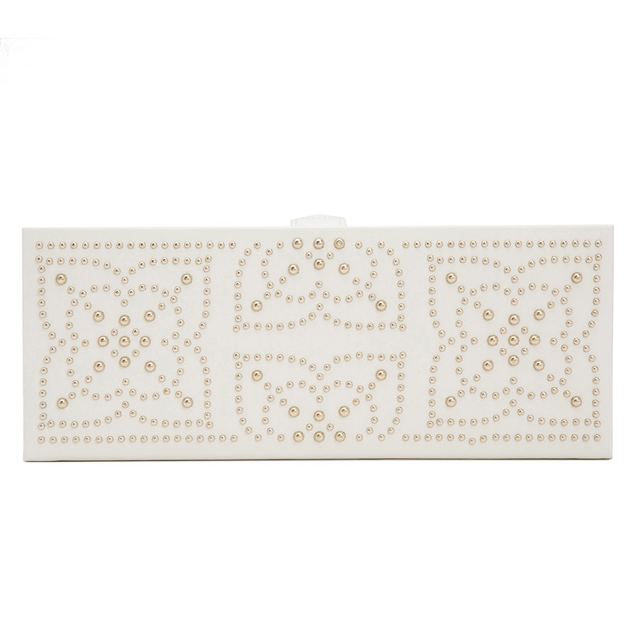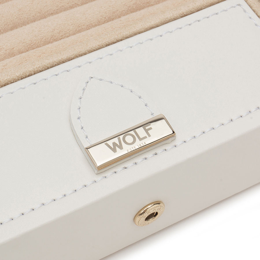 Wybierz się w podróż do egzotycznego i odurzającego miejsca, gdzie skóra i złocone ćwieki łączą się, tworząc orientalne wzory. Piękne pudełko na biżuterię WOLF Marrakesh 308453 w kolorze kremowym z 5 przegródkami i 3 rolkami na pierścionki. Kształt i wymiary 27,5 cm x 11,4 cm x 5 cm (długość, szerokość, wysokość) sprawiają, że ta szkatułka idealnie mieści się w większości sejfach lub może być wspaniałym kompanem w podróży. Wnętrze jest wyścielone specjalnym materiałem WOLF LusterLoc™ absorbującym gazy, które sprawiają, że biżuteria matowieje i ciemnieje. Tym samym zapewnia nienaganny wygląd biżuterii przez co najmniej 35 lat. Na klapie wewnątrz pudełka znajduje się również eleganckie lusterko.