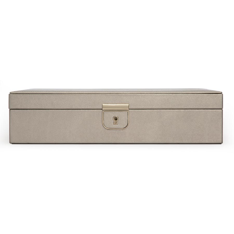 Urocze i wyrafinowane pudełko na biżuterię Wolf Palermo 213278 czerpie inspiracje z Włoskiego miasta o tej samej nazwie. Ten luksusowy futerał na biżuterię, owinięty piękną skórą w kolorze szarym, zapewnia bezpieczne miejsce na cenne przedmioty. Wnętrze jest wyścielone specjalnym materiałem WOLF LusterLoc™ absorbującym gazy, które sprawiają, że biżuteria matowieje i ciemnieje. Tym samym zapewnia nienaganny wygląd biżuterii przez co najmniej 35 lat. Na klapie wewnątrz pudełka znajduje się również eleganckie lusterko.