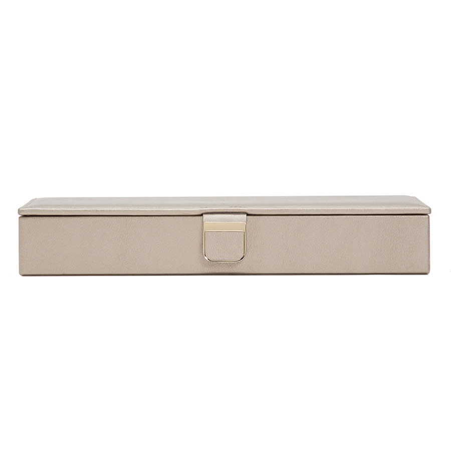 Urocze i wyrafinowane pudełko na biżuterię Wolf Palermo 213578 czerpie inspiracje z Włoskiego miasta o tej samej nazwie. Ten luksusowy futerał na biżuterię, owinięty piękną skórą w kolorze szarobeżowym, zapewnia bezpieczne miejsce na cenne przedmioty podczas podróży. Kształt i wymiary 27,9 cm x 11,9 cm x 4,7 cm (długość, szerokość, wysokość) sprawiają, że ta szkatułka idealnie mieści się w sejfie. Wnętrze jest wyścielone specjalnym materiałem WOLF LusterLoc™ absorbującym gazy, które sprawiają, że biżuteria matowieje i ciemnieje. Tym samym zapewnia nienaganny wygląd biżuterii przez co najmniej 35 lat. Na klapie wewnątrz pudełka znajduje się również eleganckie lusterko.