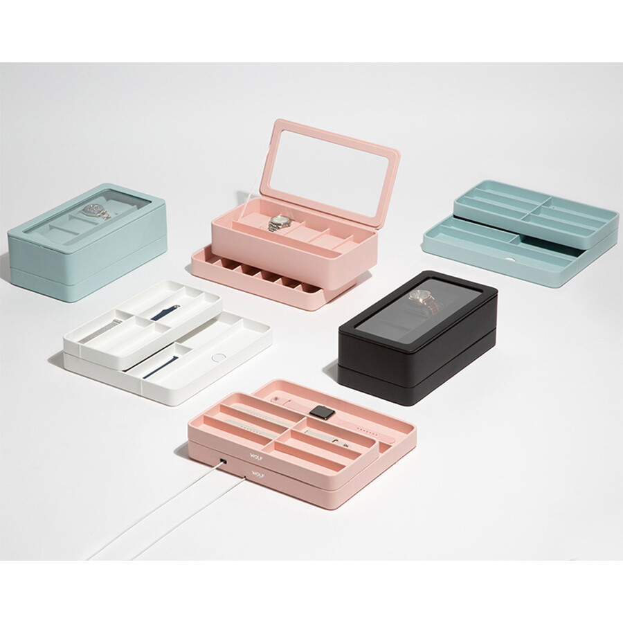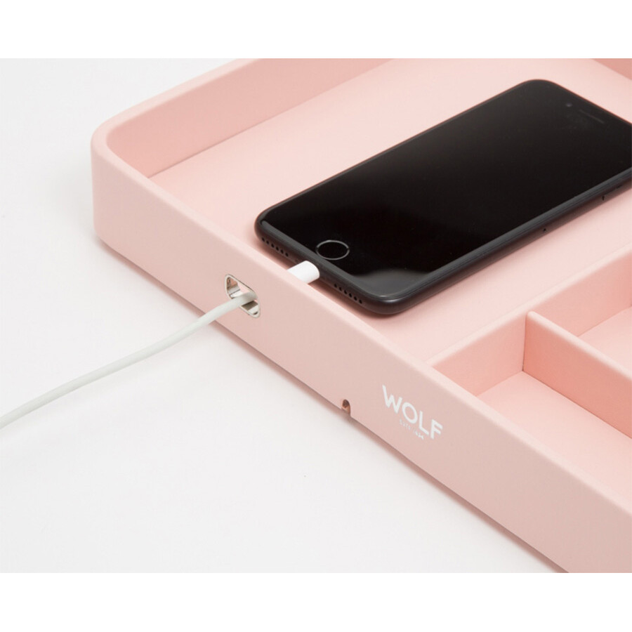 Ekskluzywne pudełko w kolorze różowym na zegarek Apple Watch. Powstało z myślą o rozwoju zegarków typu smartwatch. Niepowtarzalny design i wysokiej jakości wykonanie, które doda powiewu świeżości do każdego wnętrza. Dzięki 10 przegródkom na paski do zegarków Apple, a także portowi do ładowania iPhone'a oraz wbudowanej ładowarce indukcyjnej, bezprzewodowej do zegarka Apple Watch, mają Państwo wszystko, czego potrzebują w jednym, spójnym miejscu.