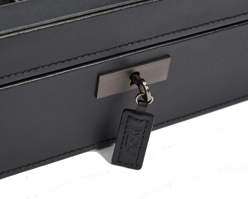 Eleganckie, wysokiej jakości czarne pudełko na 10 zegarków — WOLF Axis. Szklana pokrywa, zamykane na kluczyk, port USB. Pudełko wykończone skórą wegańską.