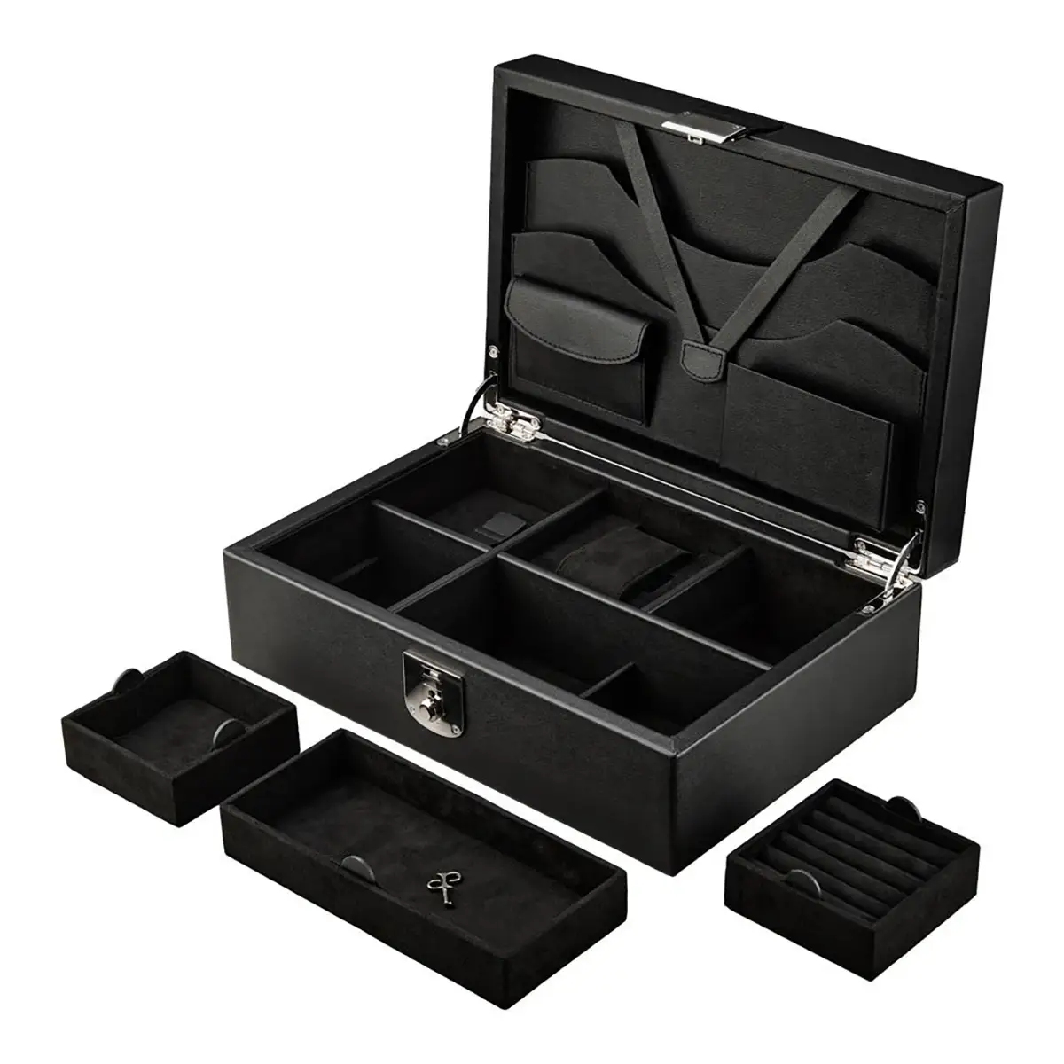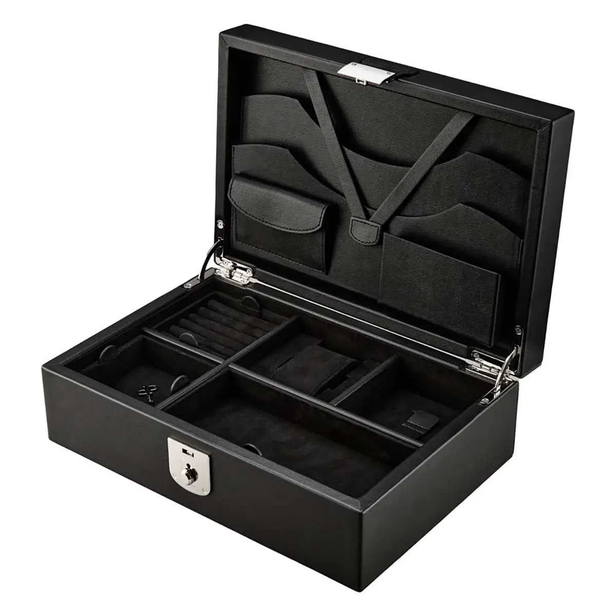Wnętrze wyściełane materiałem Ultrasuede z technologią LusterLoc™ chroni przechowywane przedmioty przed matowieniem i zarysowaniami. Przemyślana konstrukcja zawiera zawieszaną poduszkę na zegarek, wyjmowaną tackę z miejscem na pierścionki, trzy przegródki na biżuterię oraz osobną sekcję na długopis. Górna pokrywa została wyposażona w harmonijkowy organizer na dokumenty i korespondencję, kieszeń zapinaną na zatrzask oraz specjalne miejsce na etui na karty (etui nie jest częścią zestawu).