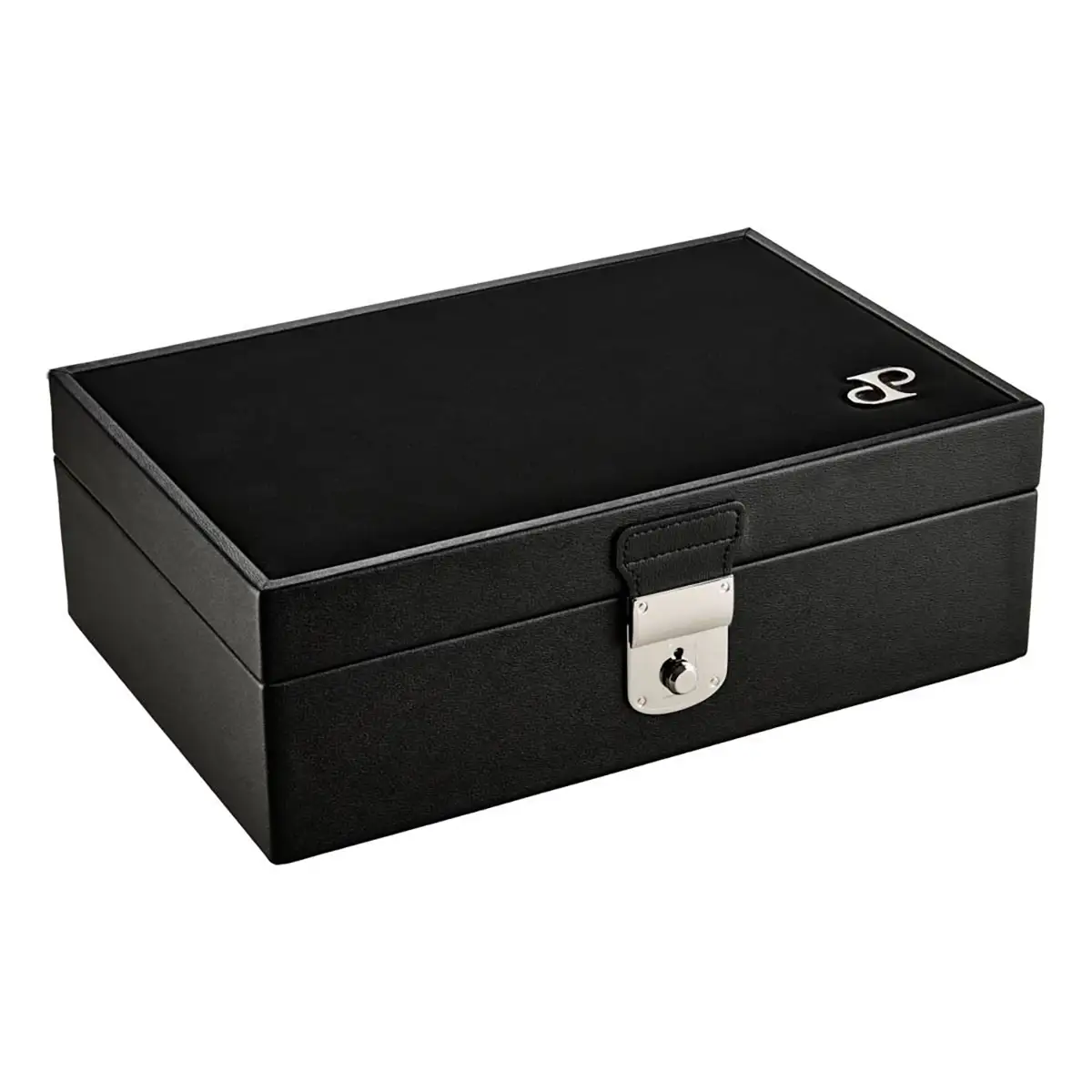 WOLF Philipp 190202 to ekskluzywne pudełko na zegarek i biżuterię, które łączy klasyczny styl vintage z nowoczesnym wykończeniem. Zaprojektowane z myślą o codziennej organizacji i estetyce, stanowi doskonały wybór dla osób ceniących jakość, design i funkcjonalność w jednej formie. Czarna fakturowana skóra wegańska została uzupełniona eleganckimi akcentami z nubuku oraz metalowym logo „DP” w srebrnym kolorze, tworząc ponadczasowy, luksusowy wygląd.