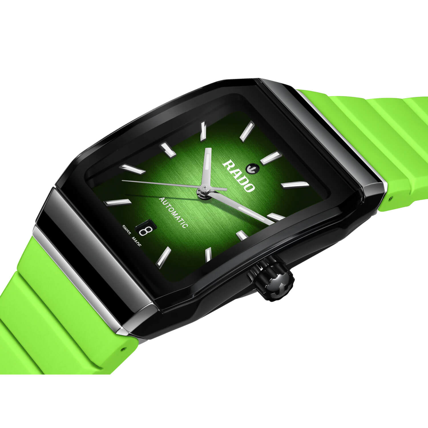 Od przodu zegarek ceramiczny Rado osłonięty został cylindrowym szkłem szafirowym z antyrefleksyjną powłoką. Gradientowa, zielono-czarna tarcza jest teraz lakierowana i wykończona szczotkowaniem. Aktualną godzinę wskazują powiększone wskazówki ze świecącą masą luminescencyjną. Na pełnych punktach godzinowych osadzone zostały eleganckie indeksy, które również świecą w ciemności po wcześniejszym naświetleniu. Pod napisem "AUTOMATIC" znalazło się miejsce dla okna datownika. Na ciemnym tle wyświetlany jest aktualny dzień miesiąca. Pod tarczą zainstalowany został szwajcarski mechanizm Rado — kaliber R766 z automatycznym naciągiem. Entuzjastów mechanizmów automatycznych z pewnością zadowoli wysoka rezerwa chodu do 72 godzin i antymagnetyczna sprężyna włosowa Nivachron™. Sprężyna krzemowa chroni mechanizm przed namagnesowaniem, jak i wyższymi temperaturami.