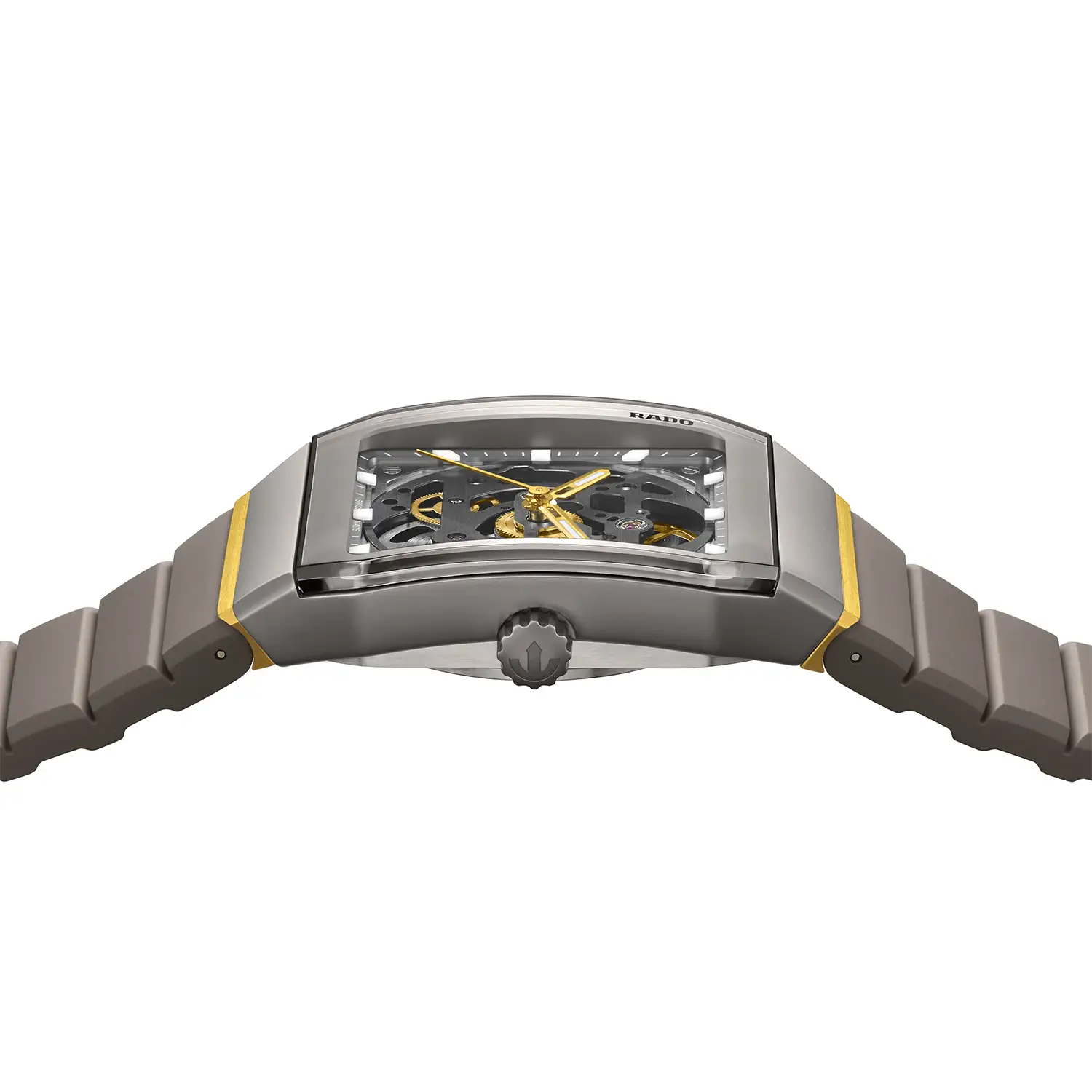 Koperta o wymiarach 32.5 × 46.3 × 11.5 mm łączy matową ceramikę high-tech w odcieniu plasma z elementami ze szczotkowanej stali oraz subtelnymi akcentami w kolorze żółtego złota PVD. Cylindryczne szkło szafirowe z fazowanymi krawędziami i wewnętrzną powłoką antyrefleksyjną zostało osadzone tak, aby płynnie przechodziło w linię koperty, potęgując efekt anatomicznego dopasowania. Szara metalizacja ramy oraz czarne logo Rado porządkują kompozycję, a elastyczny, odporny na promieniowanie UV i czynniki chemiczne pasek z wysokiej klasy kauczuku zapewnia trwałość oraz komfort użytkowania na co dzień.