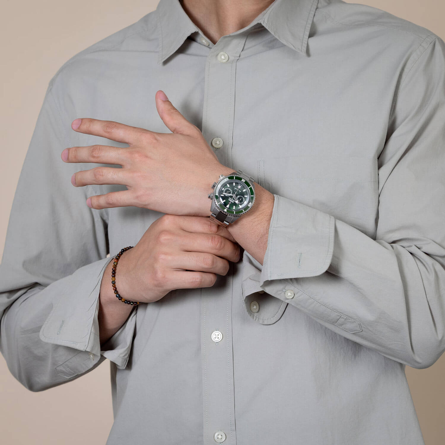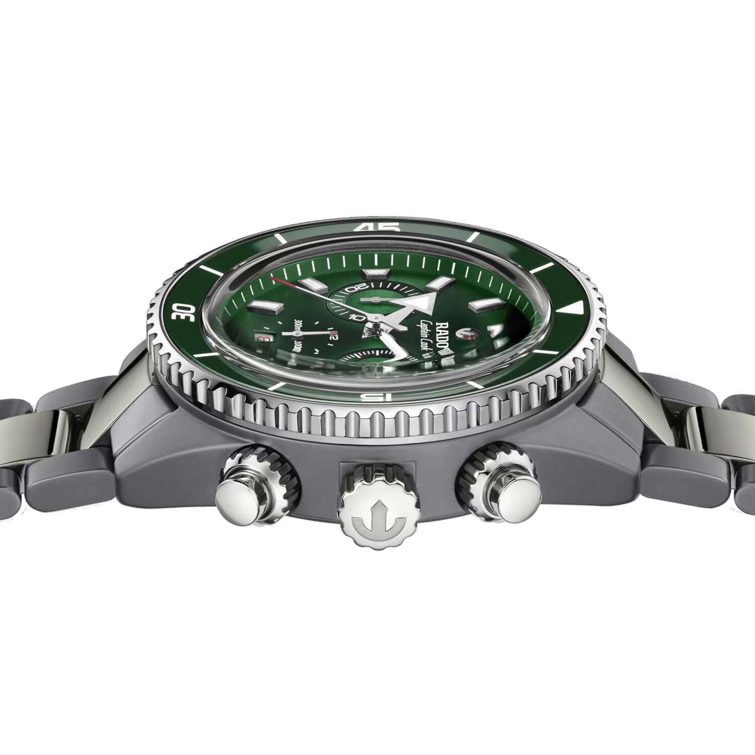 Estetyka? Opiera się na grze światła i głębi koloru. Szarość high-tech ceramicznej koperty kontrastuje z intensywną zielenią tarczy i ceramicznej wkładki na obrotowym bezelu, tworząc kompozycję dynamiczną, ale wciąż elegancką. Luneta uzupełniona o podziałkę z masą luminescencyjną Super-LumiNova® zapewnia doskonałą czytelność, wspieraną przez wyraziste indeksy i wskazówki świecące w ciemności. Szkło szafirowe z podwójną powłoką antyrefleksyjną gwarantuje krystaliczną przejrzystość, a harmonijny układ tarczy z datownikiem na godzinie 6 i kultową rubinową kotwicą Rado dodaje całości charakterystycznego wyrazu.