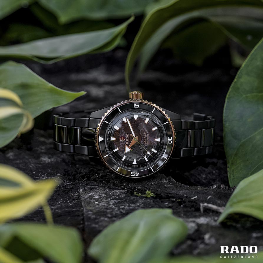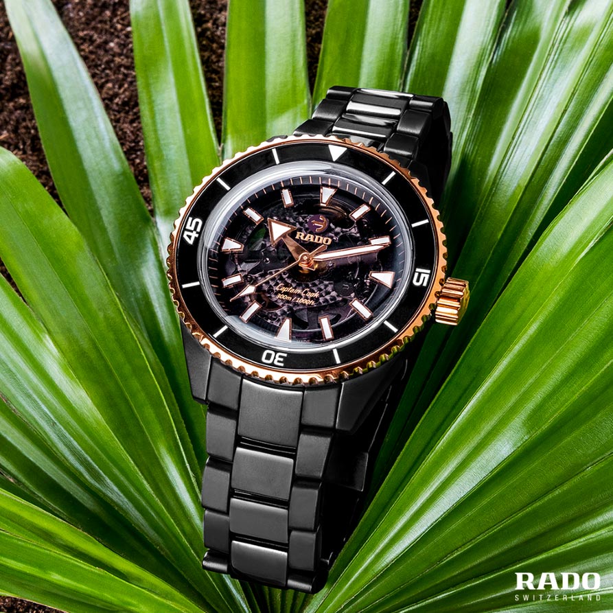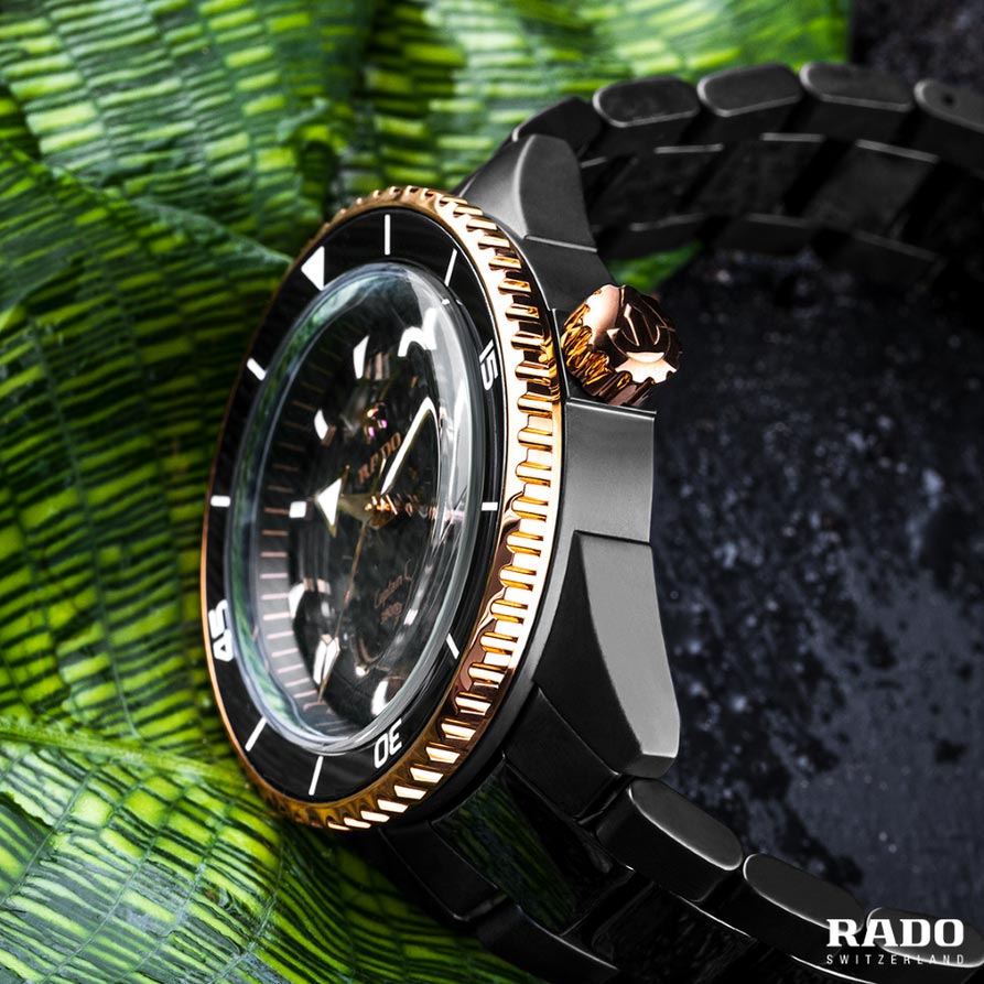 Rado Captain Cook High-Tech Ceramic R32127162 odznacza się jednymi z najzacniejszych dokonań marki - innowacyjną i zaawansowaną technologicznie konstrukcją ceramicznej obudowy o charakterze monobloc, nierysującą się, hipoalergiczną oraz przyjemną w dotyku ceramiką high-tech, a także mechanizmem rangi premium z nowatorską, chroniącą zegarek przed oddziaływaniem pól magnetycznych sprężyną włosową Nivachron™. Jego pracę użytkownik ma okazję podziwiać zarówno dzięki szkieletowej tarczy, jak i przeszklonemu szkłem szafirowym dekielkowi, który jest wodoszczelny aż do około 300 m.