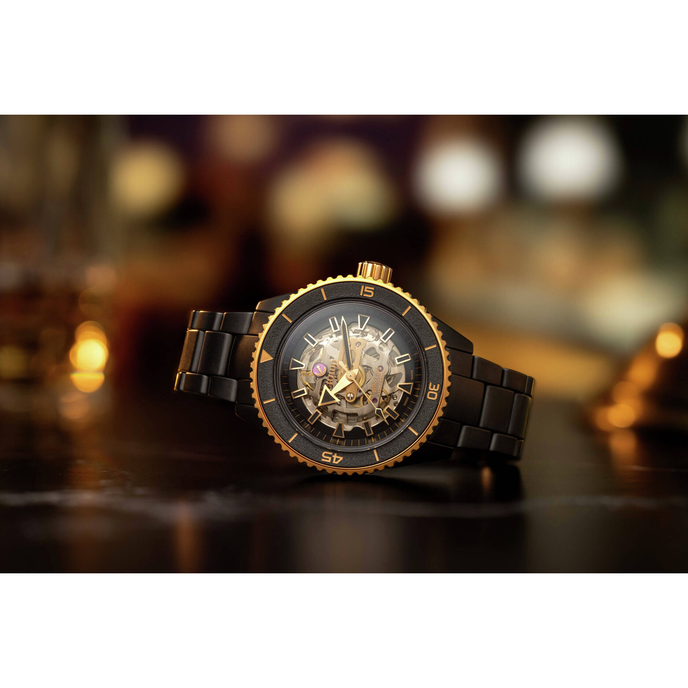 Kultowe szafirowe szkło z wyraźnie zarysowanymi krawędziami oraz powłoką antyrefleksyjną po obu stronach odsłania stylową, przydymioną tarczę, która nadaje temu zegarkowi Rado wyjątkowy charakter. Odkryty mechanizm, pełen intrygujących detali i przezroczysta płyta, podkreślają nowoczesną geometrię projektu. Jak w każdym modelu Rado Captain Cook Skeleton Automatic, design jest wyraźnie męski, z harmonijną kompozycją wzmocnioną odważnymi, wyrazistymi znacznikami na pierścieniu, dużymi cyframi, wskazówkami oraz indeksami. Dla lepszej widoczności w słabym oświetleniu, wskazówki i indeksy pokryto powłoką Super-LumiNova® w intensywnie czarnym kolorze, która emituje efektowną, niebieską poświatę, przywodzącą na myśl głębiny kosmosu Sprawdzony i niezawodny automatyczny kaliber R808 przetestowany we wszystkich pięciu pozycjach i wyposażony w antymagnetyczną sprężynę włosową Nivachron™ zapewnia wyjątkową precyzję i robiącą wrażenie rezerwę chodu do 80 godzin. Dzięki drugiemu szafirowemu szkłu w tytanowym deklu z powłoką PVD mechanizm oraz jego komponenty, misterne warstwy i detale można obserwować w działaniu zarówno z góry, jak i z dołu zegarka.