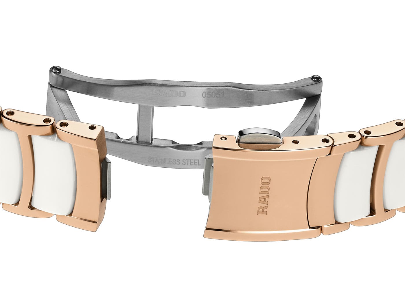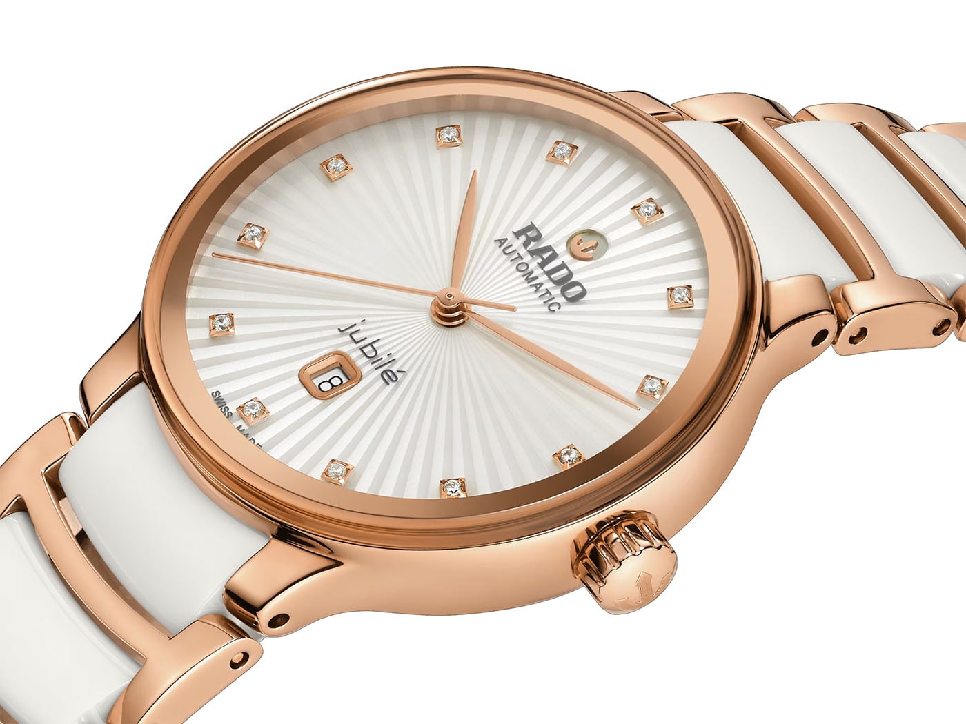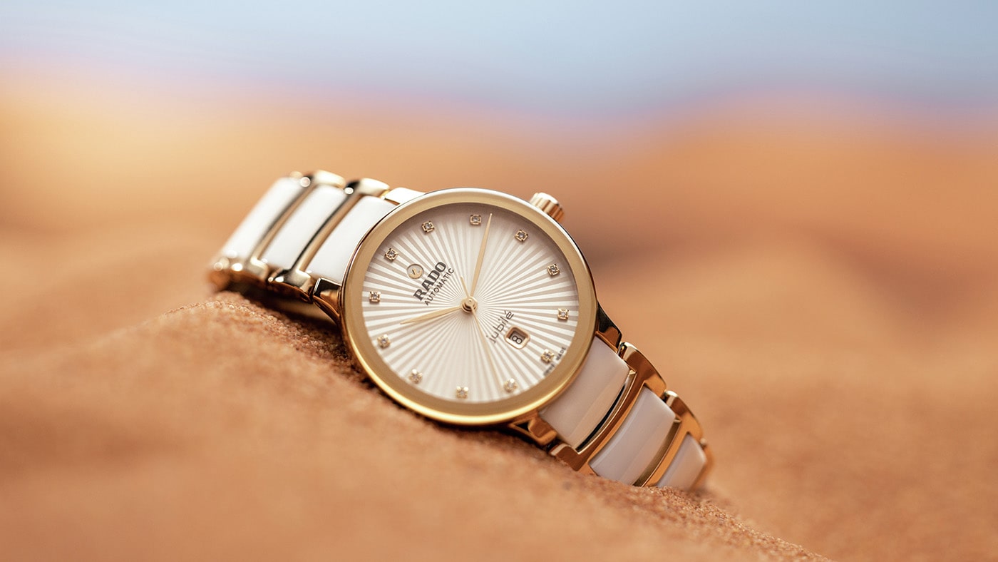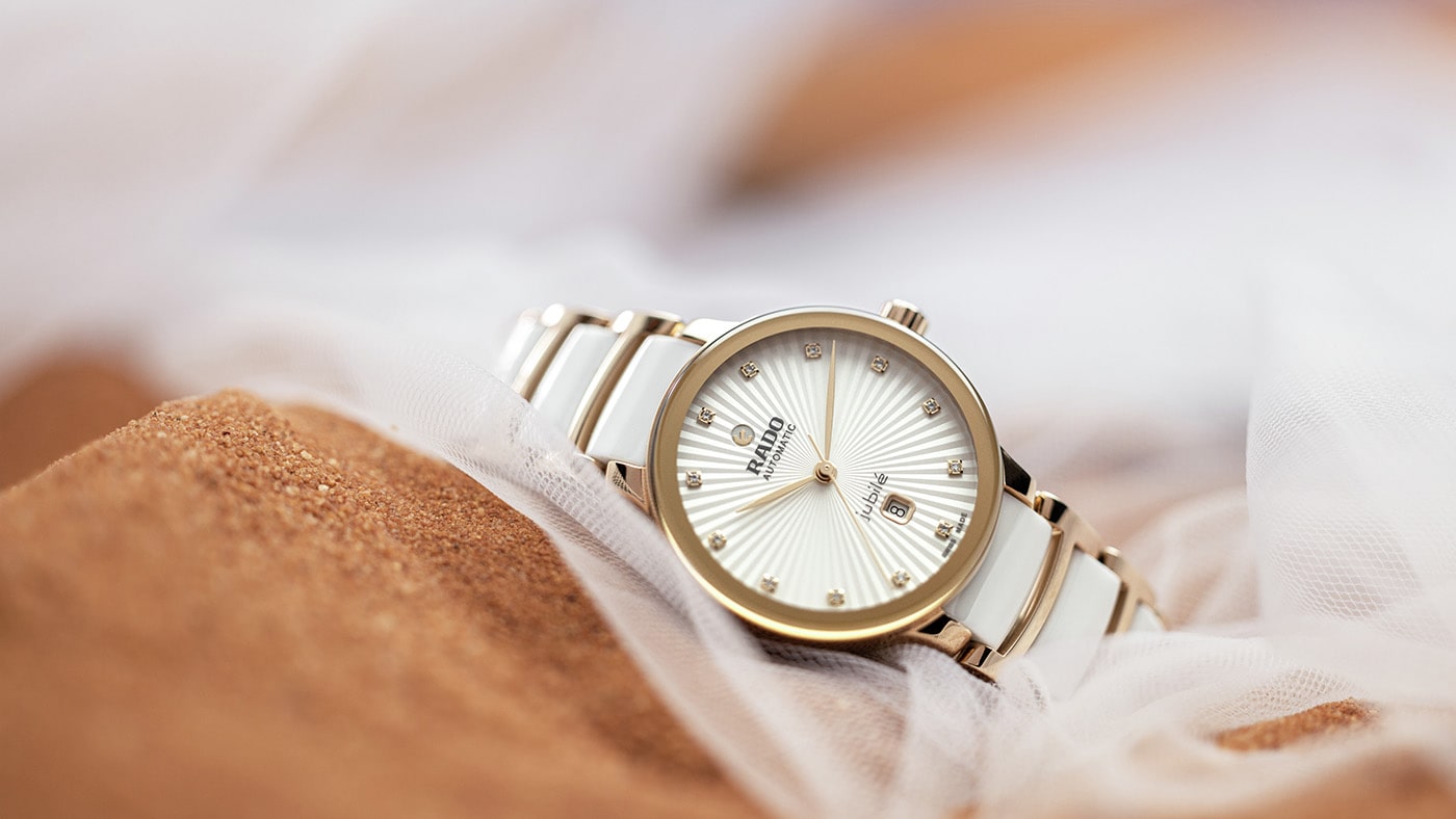 Ogólny wygląd tego kultowego, ceramicznego zegarka Rado z prawdziwymi diamentami uzupełniają dopasowane uszy 30,5-milimetrowej koperty oraz bransoleta. Ta druga została wykonana z polerowanej stali nierdzewnej powlekanej metodą PVD w kolorze różowego złota, a także z zaawansowanej technologicznie ceramiki (białe ogniwa). Mistrz Materiałów od dekad zajmuje się ceramiką high-tech, czego wynikiem są zegarki o unikalnym kolorze oraz jakości dotykowej.