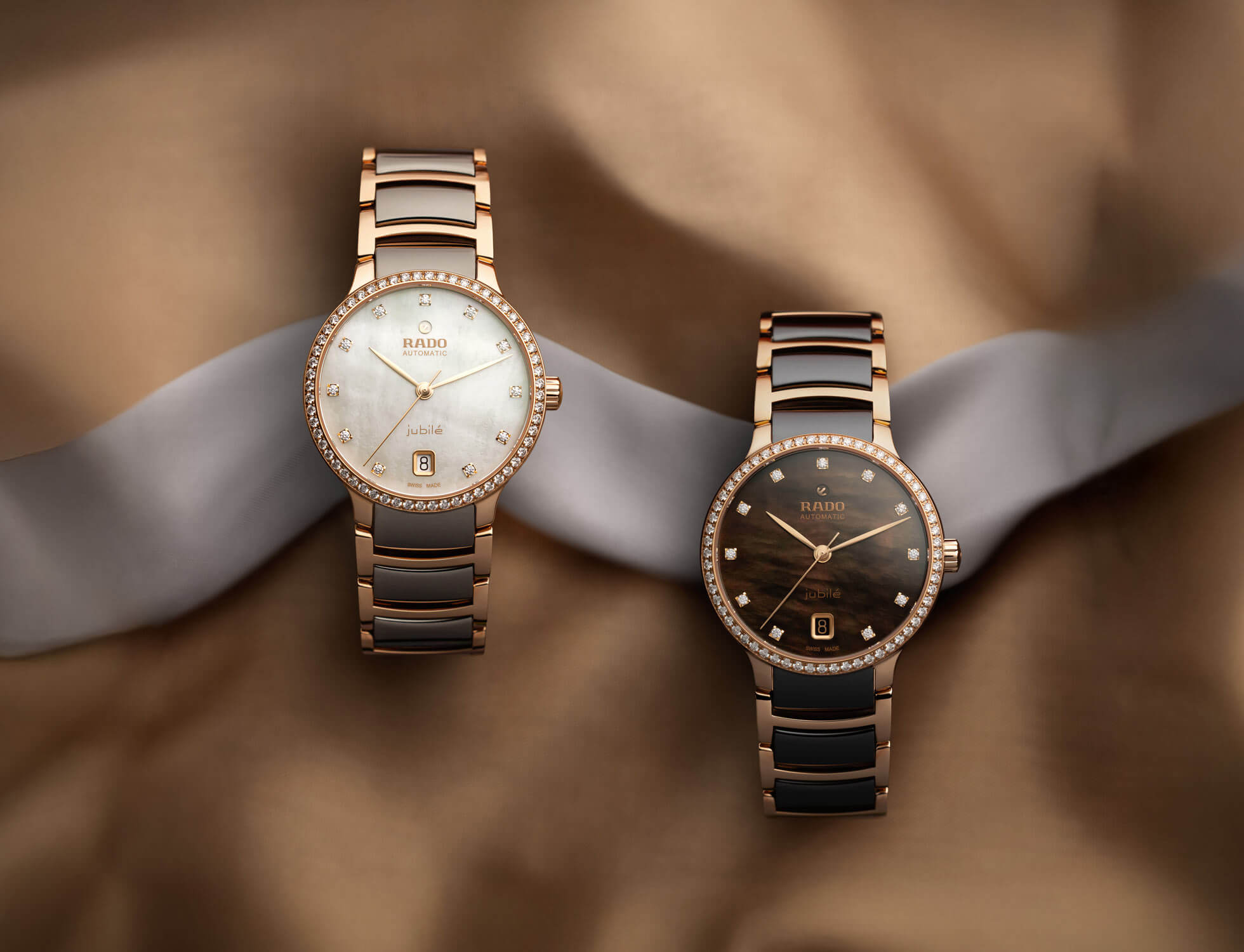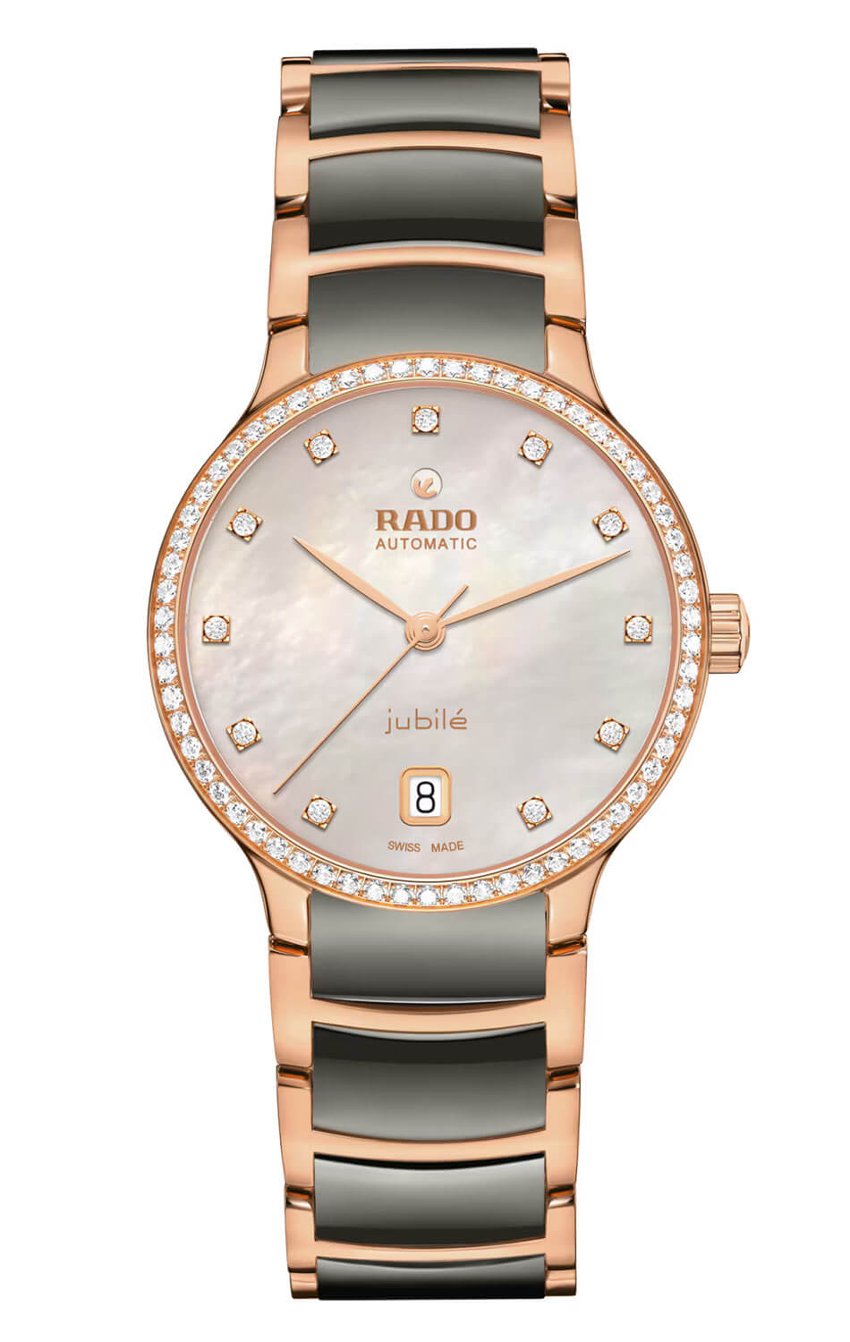 Lśniąca koperta o średnicy 35 mm została wykonana ze stali szlachetnej pokrytej powłoką PVD w kolorze różowego złota. Jej pierścień zdobi 60 diamentów Top Wesselton VS–SI o łącznej masie 0.792 ct, które tworzą migoczący krąg światła wokół tarczy z masy perłowej. Każdy z 11 diamentowych indeksów (0.11 ct) został starannie osadzony, by odbijać światło w sposób przypominający rozżarzone drobiny bursztynu. Napisy „Jubilé” oraz „Automatic”, a także ruchomy symbol kotwicy Rado w tonacji różowego złota podkreślają wyjątkowy charakter modelu. To czasomierz, który zachwyca z bliska, ale urzeka dopiero wtedy, gdy zobaczy się, jak gra światłem na nadgarstku.