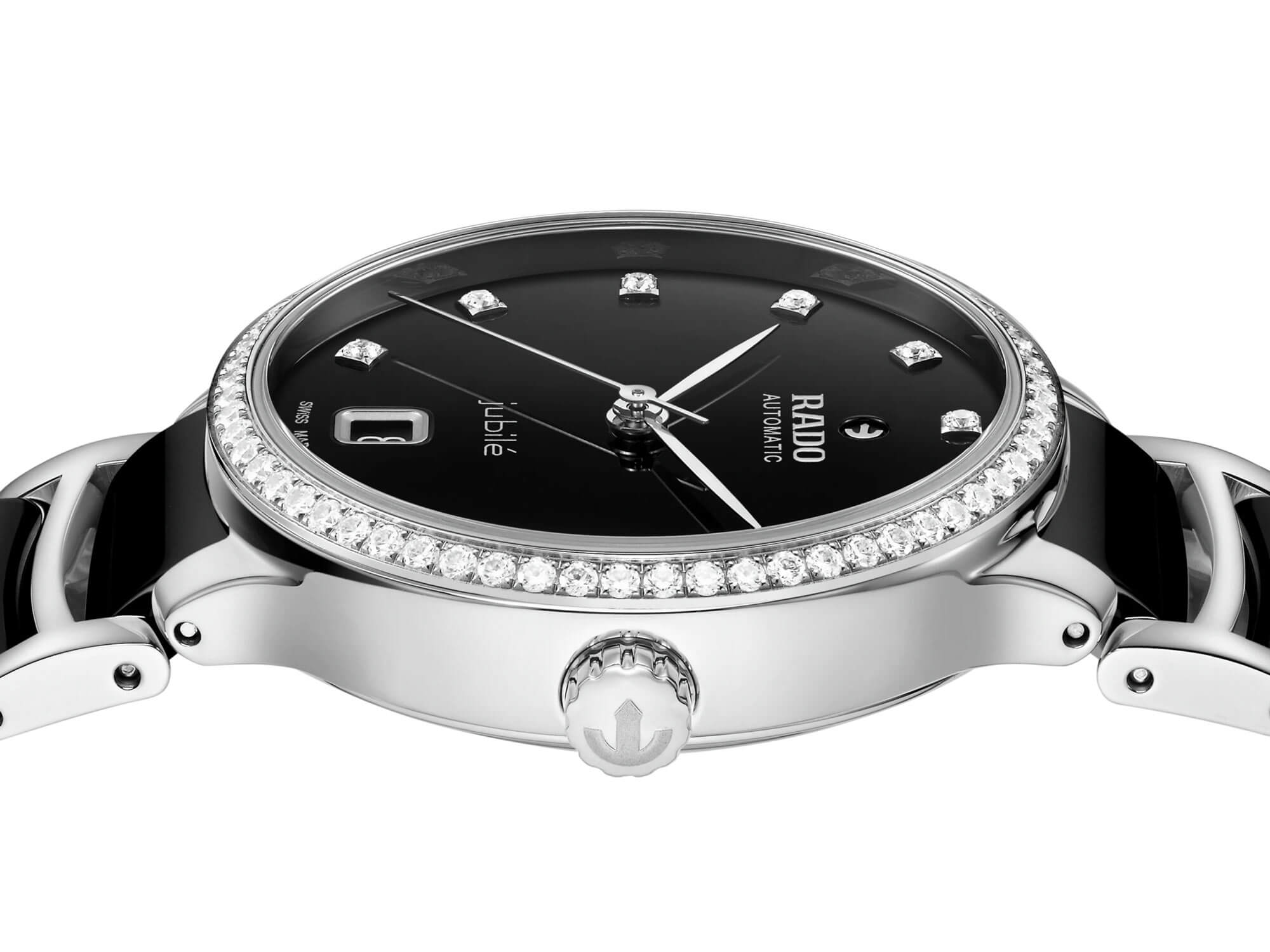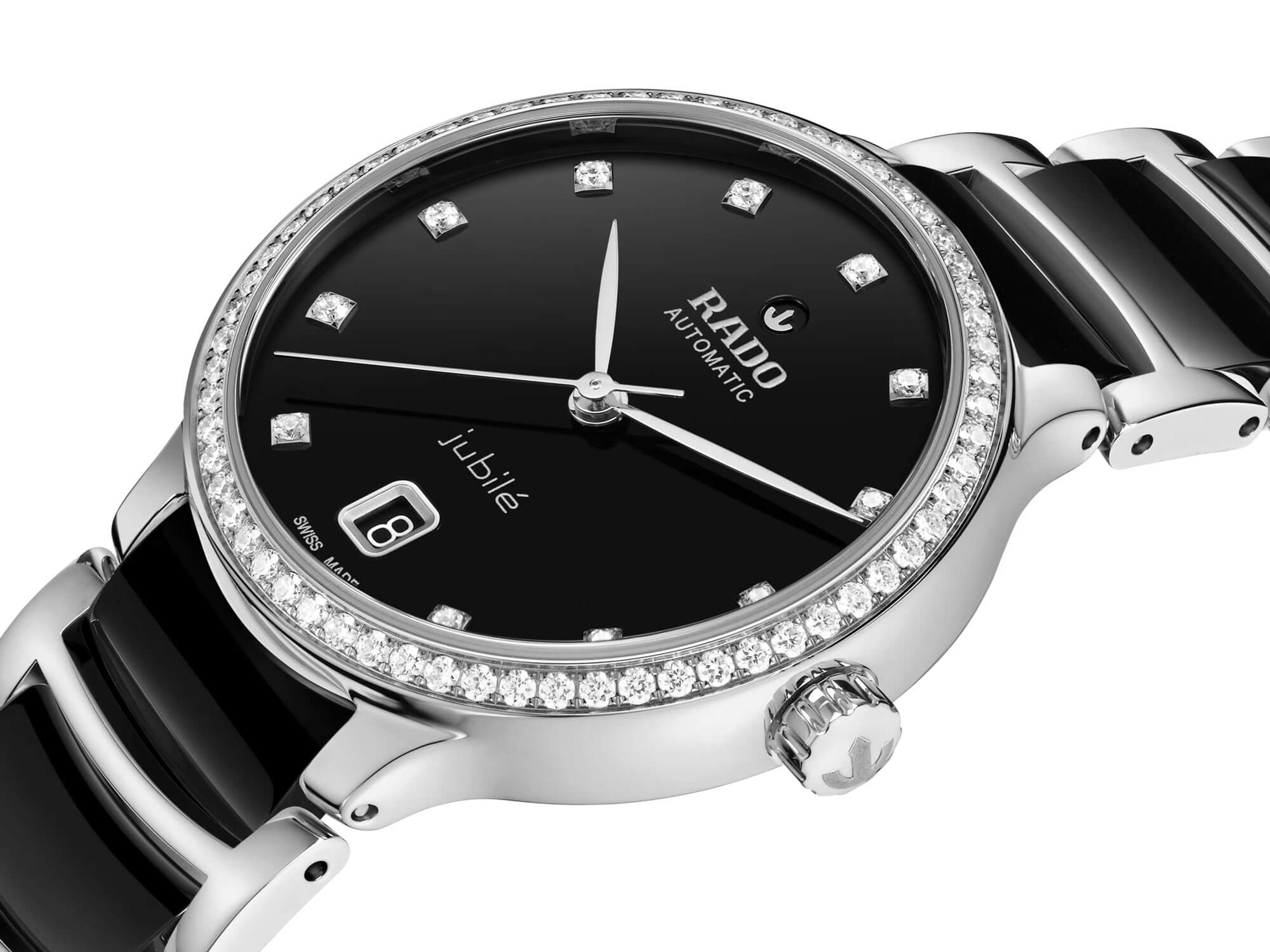 Zegarek Rado Centrix Super Jubile został wykonany z najnowocześniejszych materiałów, które łączą estetykę z funkcjonalnością. Koperta o średnicy 35 mm, stworzona z wysokogatunkowej stali szlachetnej, zapewnia trwałość i odporność na uszkodzenia, a jednocześnie zachowuje lekkość i komfort noszenia. Niezwykle ważnym elementem tego modelu jest bransoleta, która stanowi połączenie stalowych elementów z eleganckimi, czarnymi ogniwami ceramicznymi z materiału high-tech. Ceramika ta nie tylko urzeka głęboką barwą i idealnie gładką powierzchnią, ale jest także hipoalergiczna, co sprawia, że zegarek nie uczula. Przez transparentny dekiel można podziwiać pracę automatycznego mechanizmu Rado z rezerwą chodu do 80 godzin, który wyposażony jest w antymagnetyczną sprężynę Nivachron™. Ten nowoczesny dodatek minimalizuje wpływ pól magnetycznych na precyzję chodu, co gwarantuje niezawodność działania w każdej sytuacji.
