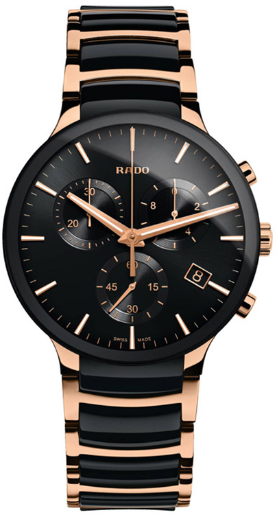 Elegancki, a zarazem sportowy zegarek dla mężczyzn Rado Centrix Chronograph R30187172 01.312.0187.3.017. Okrągła koperta ze stali szlachetnej z delikatnymi przyciskami i koronką z boku. Od góry zamknięta jest szafirowym szkłem zdobionym czarnym obramowaniem. Wewnątrz eleganckiej obudowy znajduje się tarcza w kolorze czarnym ze wskazówkami i licznikami chronografu w kolorze złotym. Stoper odmierza dziesiętne sekundy, sekundy oraz minuty. Dodatkową funkcją kwarcowego mechanizmu jest datownik na godzinie 4. Klasyczny design i płynne kształty w najlepszy sposób wyrażający elegancję oraz przejrzystość z nutką sportowej tarczy. Czarne elementy bransolety wykonane są z najwyższej jakości ceramiki, odpornej na zarysowania, hipoalergicznej i bardzo wygodnej w noszeniu. Nad bezpieczeństwem czuwa tytanowe zapięcie składane z dwóch elementów, otwierane za pomocą przycisków.
