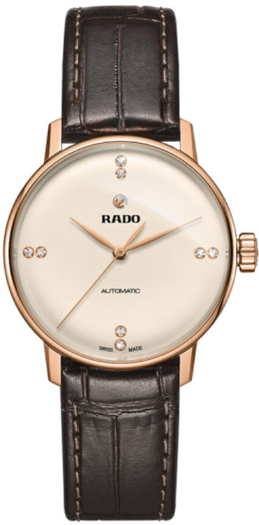 Ekskluzywny zegarek damski Rado Coupole Classic Automatic R22865765 wyposażony w mechanizm automatyczny, elegancką kopertę, na której osadzono wypukłe szkło szafirowe z antyrefleksem. Na cyferblacie pięknie kontrastują umieszczone diamenty na znacznikach godzin. Doskonały do stroju wizytowego, ale również idealnie uzupełnia codzienną garderobę. Klasyczny pasek w kolorze brązowym z wygodnym zapięciem motylkowym.