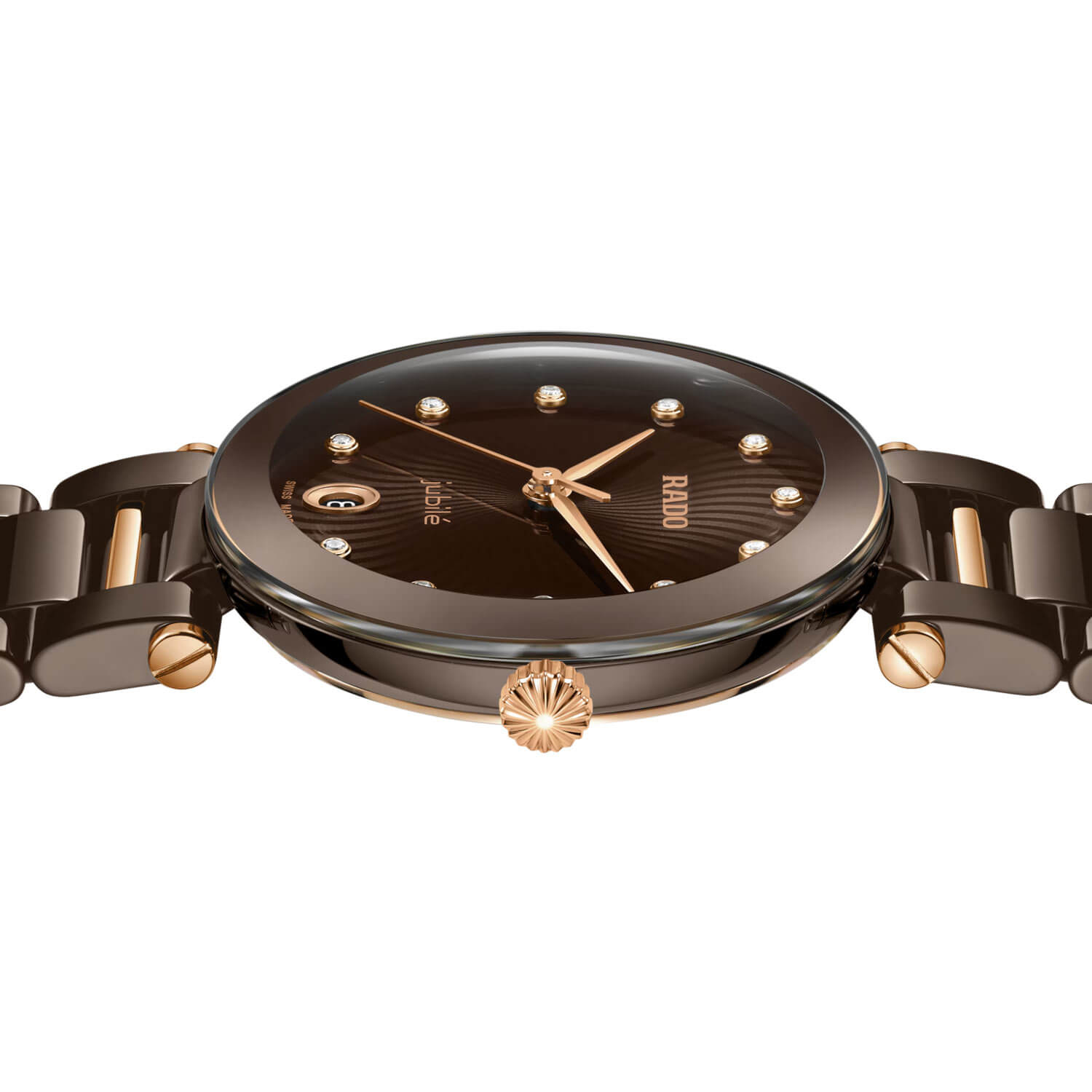 Koperta o średnicy 31 mm została wykonana z brązowej ceramiki high-tech typu monobloc, co gwarantuje trwałość i odporność na zarysowania przy zachowaniu lekkości i przyjemnego kontaktu ze skórą. Wypukłe szkło szafirowe z metaliczną obwódką dopełnia elegancką formę, a wodoszczelność do 50 metrów pozwala na swobodne użytkowanie w codziennych warunkach. Bransoleta z polerowanej ceramiki wzbogacona została o ogniwa ze stali szlachetnej w kolorze różowego złota PVD, tworząc wyważoną kompozycję wizualną i funkcjonalną. Całość zamyka wygodne, stalowe zapięcie, które wtapia się w linie bransolety bez zakłócania jej estetyki.