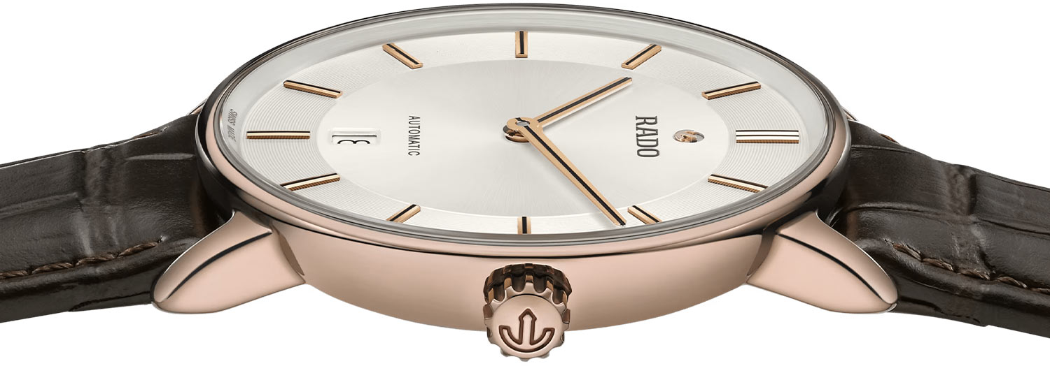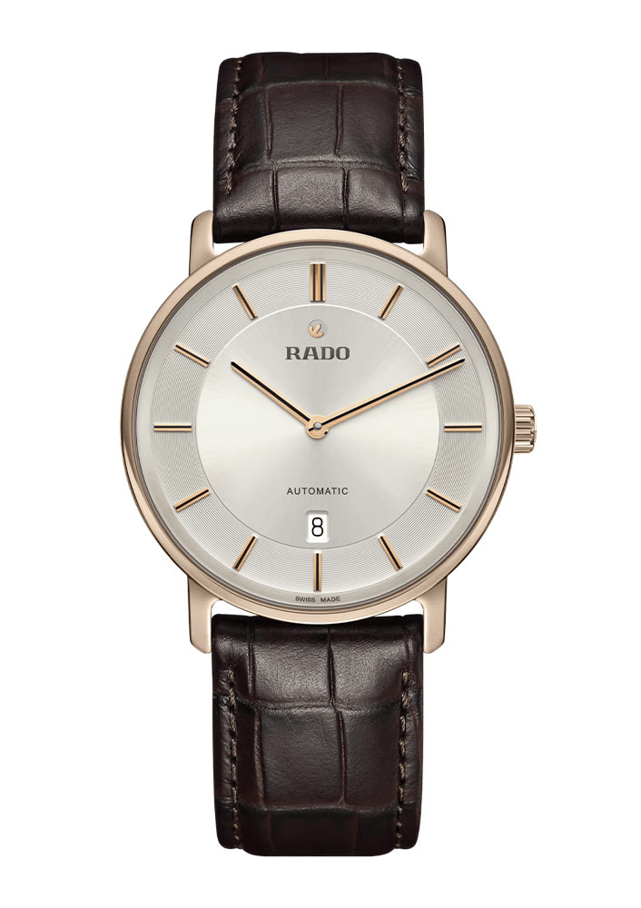 Męski zegarek Rado DiaMaster Thinline Automatic to okrągła jednoczęściowa koperta monobloc wykonana z ceramicznego materiału Ceramos™ w kolorze różowo złotym PVD. Koperta w rozmiarze 40.70 mm jest trwała, odporna na korozje oraz przyjemnie układa się na nadgarstku. Na rewersie obudowy umieszczony został, tłoczony tytanowy dekiel, którego środek wypełnia transparentne szkło szafirowe. Marka Rado swój luksusowy czasomierz zestawiła z eleganckim paskiem skórzanym w kolorze brązowym. Jest on lekki i miękki, co zapewni komfort w czasie użytkowania tego automatycznego zegarka Rado. Pasek wyposażony został w bezpieczne zapięcie motylkowe. Warto zaznaczyć, że zapięcie również stworzone zostało z ceramicznego materiału Ceramos™.