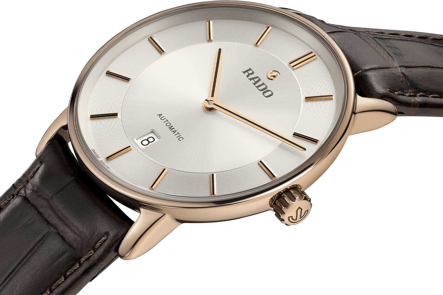 Front obudowy zabezpieczony został wysoce odpornym na zarysowania szkłem szafirowym z antyrefleksem po obu stronach. Dwustronny antyrefleks zapewnia doskonałą widoczność tarczy. Przejrzyste okno osłania srebrną tarczę z eleganckimi rodowanymi wskazówkami i indeksami. Zewnętrzny pierścień, na którym nałożone zostały, indeksy wzbogacony został o gilosz. Godzina szósta wzbogacona została o funkcję datownika, który na ciemnym tle wskazuje aktualny dzień miesiąca. Na godzinie dwunastej widnieje dumne logo marki Rado z nieodłącznym jej symbolem w postaci kotwicy. Pod tarczą zegarka Rado na bransolecie skórzanej zainstalowany został szwajcarski mechanizm automatyczny Rado R766, który napędzany jest ruchem nadgarstka. Werk oferuje bardzo wysoką rezerwę chodu aż do 72 godzin. Jego pracę podziwiać można na odwrocie ceramicznej koperty.