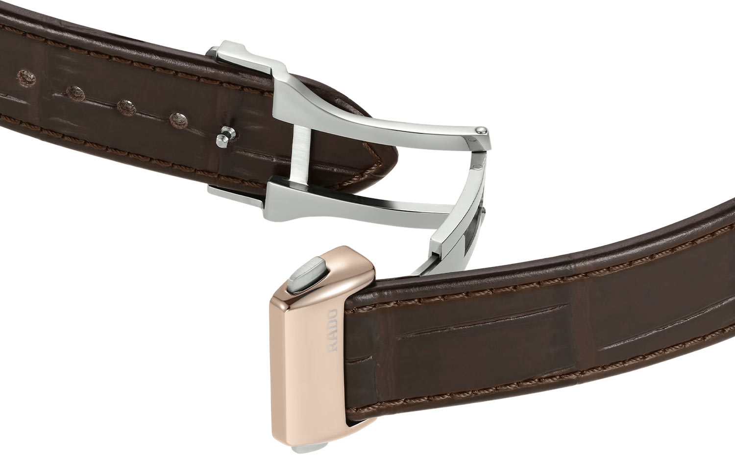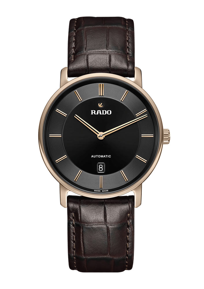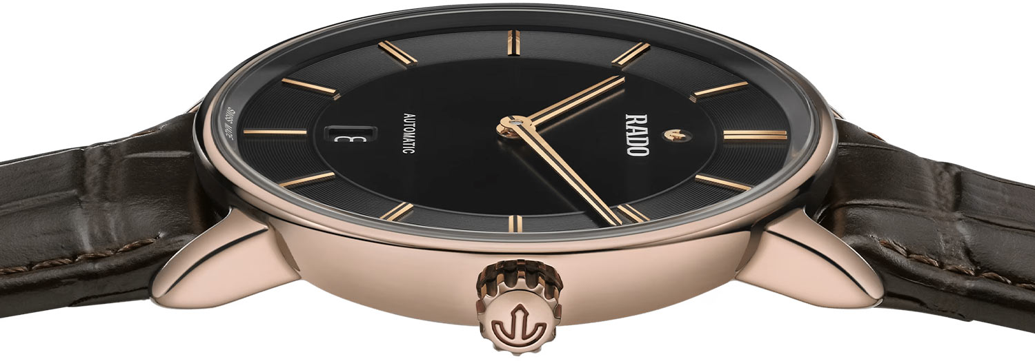 Męski zegarek Rado DiaMaster Thinline Automatic to okrągła jednoczęściowa koperta monobloc wykonana z ceramicznego materiału Ceramos™ w kolorze różowo złotym PVD. Koperta w rozmiarze 40.70 mm jest trwała, odporna na korozje oraz przyjemnie układa się na nadgarstku. Na rewersie obudowy umieszczony został, tłoczony tytanowy dekiel, którego środek wypełnia transparentne szkło szafirowe. Marka Rado swój luksusowy czasomierz zestawiła z eleganckim paskiem skórzanym w kolorze brązowym. Jest on lekki i miękki, co zapewni komfort w czasie użytkowania tego automatycznego zegarka Rado. Pasek wyposażony został w bezpieczne zapięcie motylkowe. Warto zaznaczyć, że zapięcie również stworzone zostało z ceramicznego materiału Ceramos™.