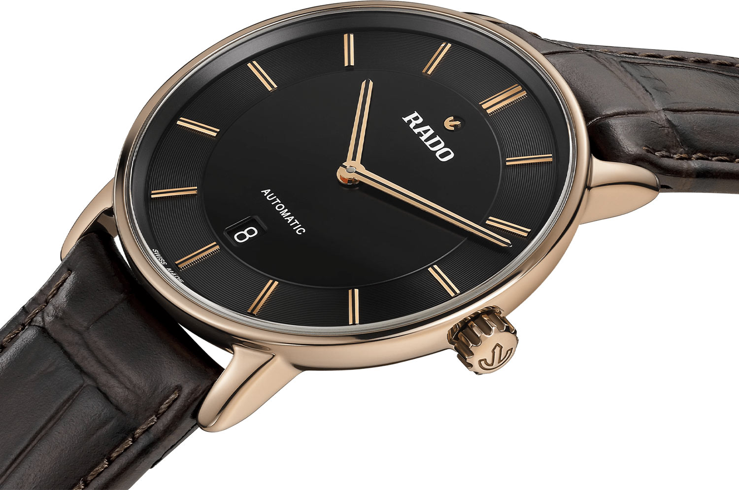 Front obudowy zabezpieczony został wysoce odpornym na zarysowania szkłem szafirowym z antyrefleksem po obu stronach. Dwustronny antyrefleks zapewnia doskonałą widoczność tarczy. Przejrzyste okno osłania czarną tarczę z eleganckimi rodowanymi wskazówkami i indeksami. Zewnętrzny pierścień, na którym nałożone zostały, indeksy wzbogacony został o gilosz. Godzina szósta wzbogacona została o funkcję datownika, który na ciemnym tle wskazuje aktualny dzień miesiąca. Na godzinie dwunastej widnieje dumne logo marki Rado z nieodłącznym jej symbolem w postaci kotwicy. Pod tarczą zegarka Rado na bransolecie skórzanej zainstalowany został szwajcarski mechanizm automatyczny Rado R766, który napędzany jest ruchem nadgarstka. Werk oferuje bardzo wysoką rezerwę chodu aż do 72 godzin. Jego pracę podziwiać można na odwrocie ceramicznej koperty.