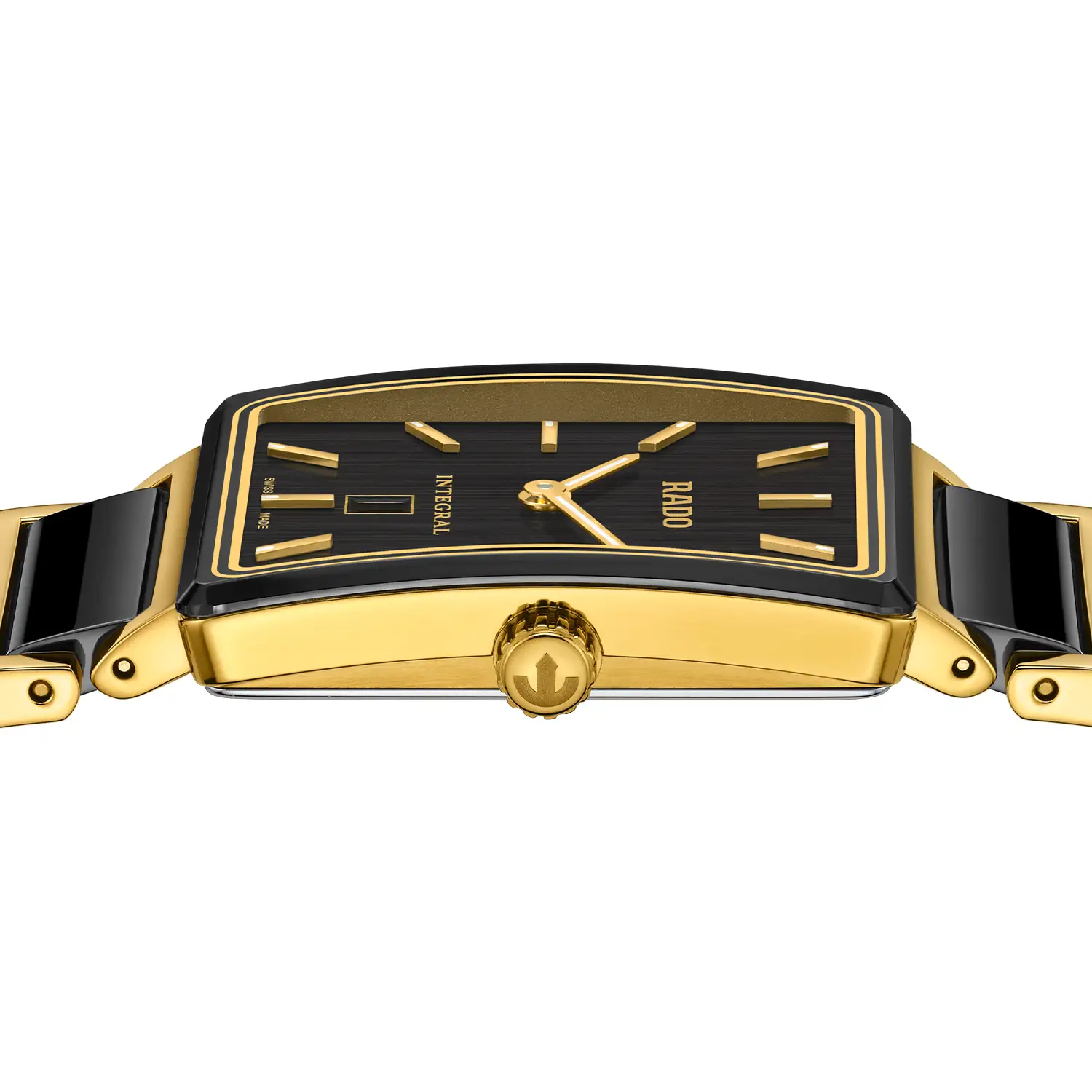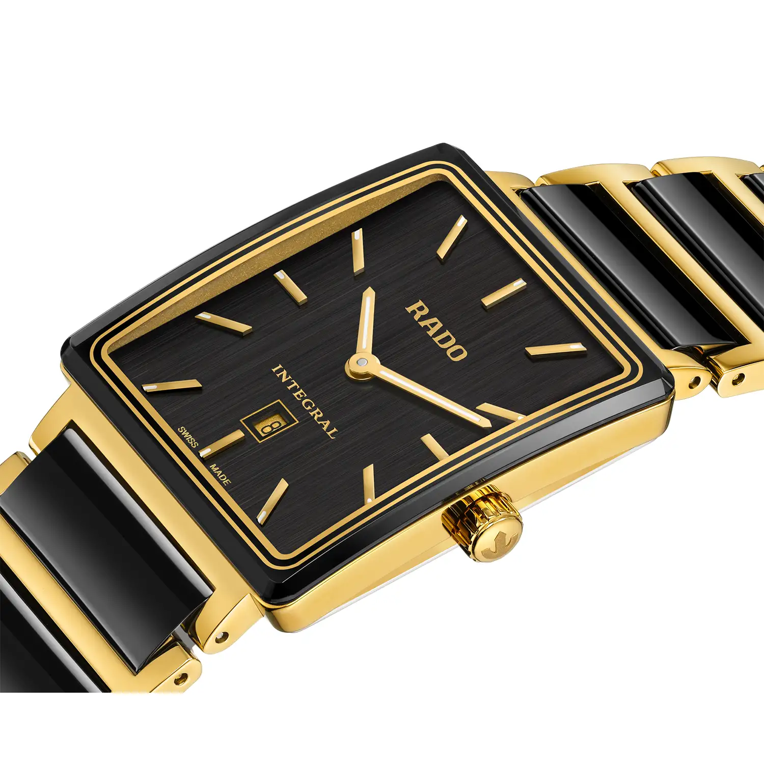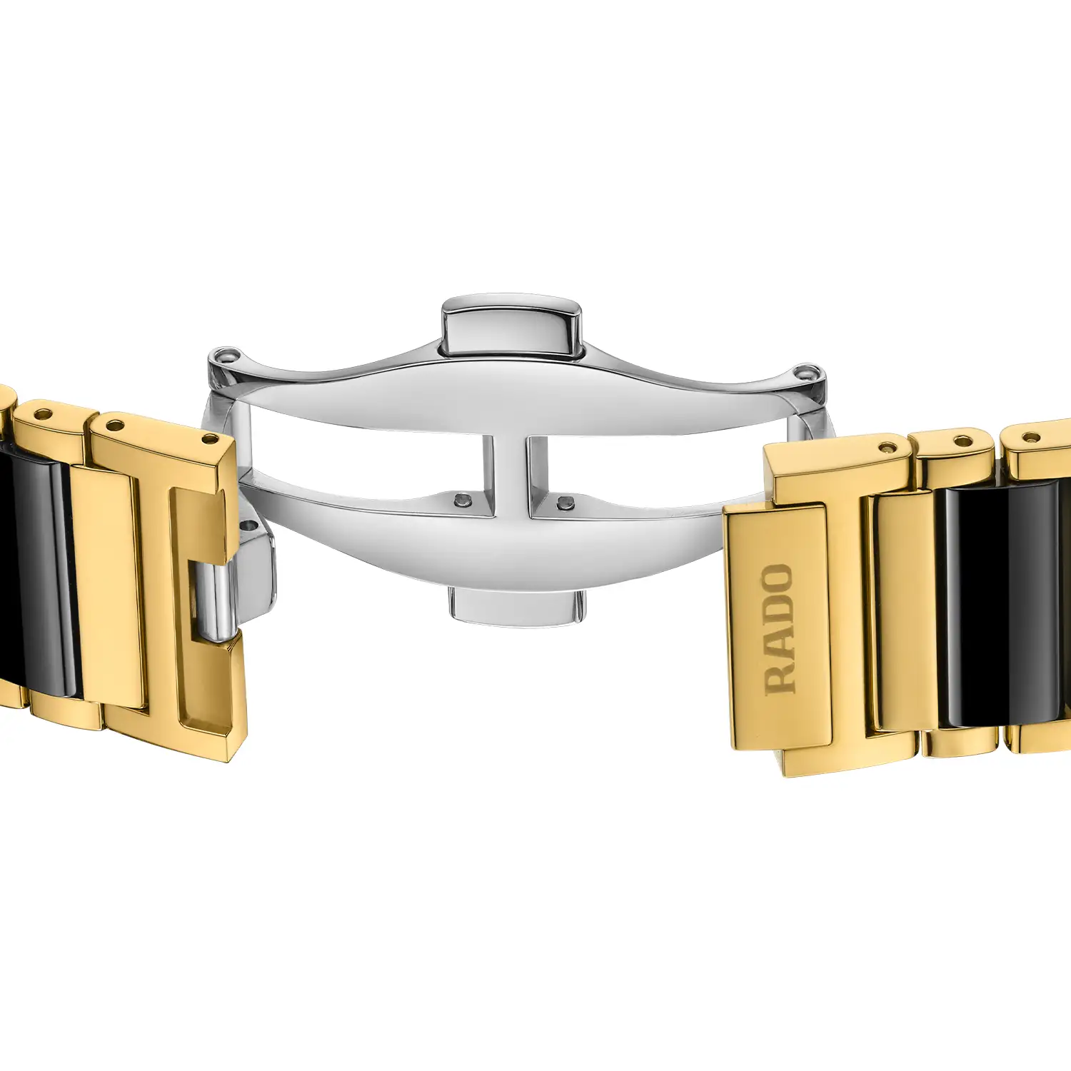 Jednym z kluczowych elementów konstrukcyjnych pozostaje zastosowanie ceramiki high-tech w środkowych ogniwach bransolety. Materiał ten, rozwijany przez Rado od dekad, wyróżnia się wyjątkową odpornością na zarysowania, niską masą oraz jedwabistą gładkością w kontakcie ze skórą. W połączeniu ze stalowymi, pozłacanymi elementami tworzy kompozycję, która nie tylko zachowuje estetyczną spójność, ale przede wszystkim przekłada się na realny komfort noszenia, nawet przez wiele godzin. To rozwiązanie, które definiuje Integral i jednocześnie stanowi jego technologiczne DNA.