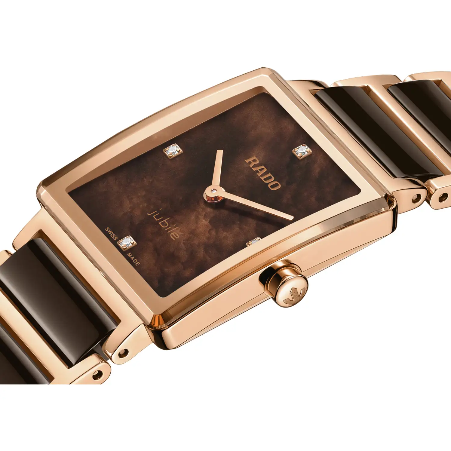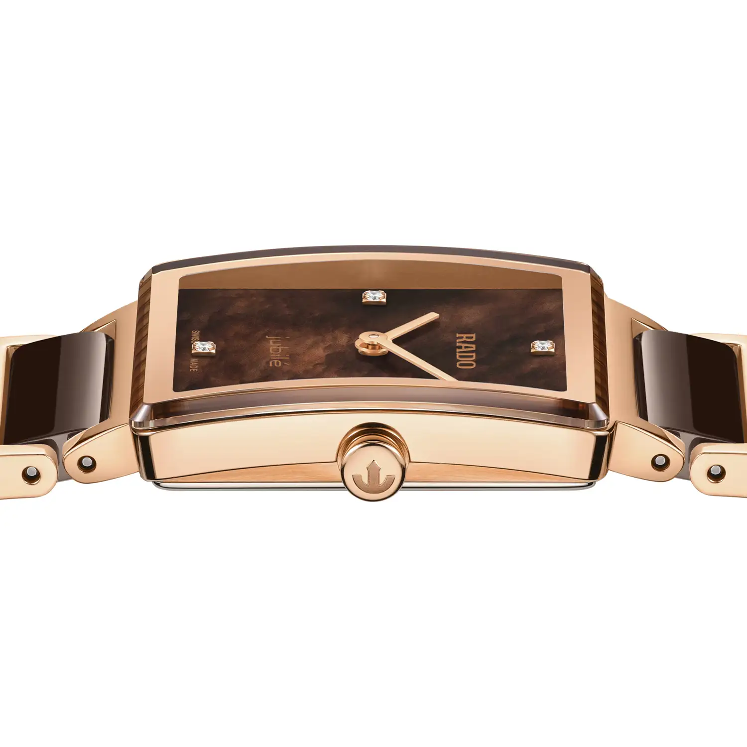 Bransoleta łączy pozłacaną stal w kolorze różowego złota z brązowymi ogniwami ceramicznymi, charakterystycznymi dla Rado i cenionymi za odporność na zarysowania oraz wyjątkową gładkość w kontakcie ze skórą. Dzięki temu zegarek pozostaje nie tylko piękny, ale i niezwykle komfortowy w codziennym noszeniu. Rado Integral Jubile to elegancki akcent, który sprawdza się zarówno jako biżuteryjny dodatek do wieczorowej stylizacji, jak i dyskretny symbol luksusu noszony każdego dnia.
