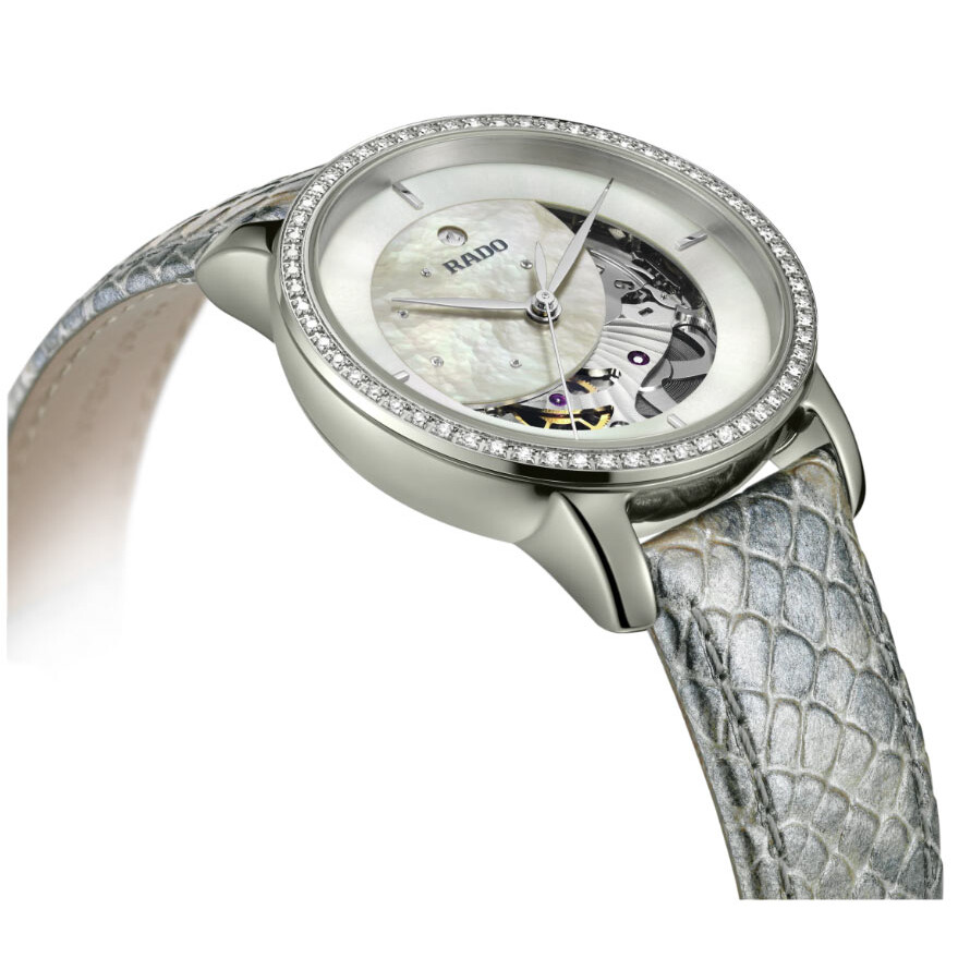 Rado DiaMaster Diamonds Automatic Lady to stylowy, elegancki i ultratrwały zegarek, czerpiący inspirację od kultowej kolekcji DiaMaster. Koperta wykonana z ceramiki Ceramos posiada kolor platyny. Dużą zaletą tego materiału jest głęboki połysk, wysoka odporność na zarysowania i jest hipoalergiczny.