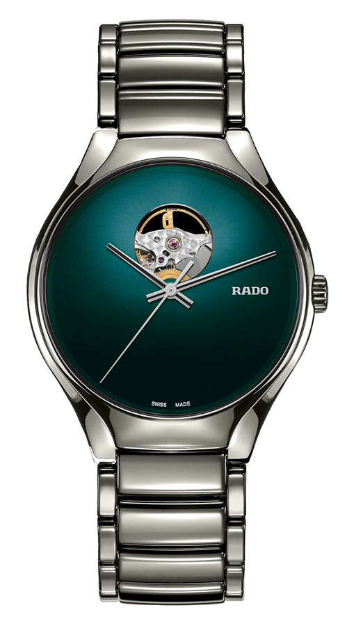 Rado True Secret Automatic zdumiewa projektem czystej tarczy o gradientowym wykończeniu w chłodnym tonie i otworem typu open-heart, przez który widać precyzyjnie bijące serce mechanizmu. Atrakcyjny gradient tworzy związek niebieskiej i zielonej barwy, kolorów, które płynnie nachodzą na siebie. Położony na godzinie 12 otwarty balans zaprasza do odkrywania sekretów, które kryją się we wnętrzu czasomierza. W ośrodku szwajcarskiej sztuki zegarmistrzowskiej. Pomimo kuszącego zaproszenia ze strony tarczy, obudowa wokół nie daje się pominąć. Przyjemne wrażenie w dotyku i metaliczny blask ceramiki plazmowej high-tech uzyskany w autorskim procesie Rado bije ze środka tworzywa i ogarnia właściciela tajemniczą aurą chłodu, a także niepojęcie magicznym urokiem. Poza wyglądem innowacyjne tworzywo gwarantuje wieloletnią trwałość, lekkość oraz komfort o jakości, której zaznać można wyłącznie w zegarkach ceramicznych RADO.