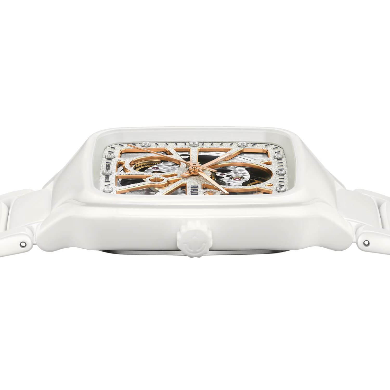 To, co przyciąga wzrok, to subtelne bogactwo wykończenia. Koperta i bransoleta wykonane z polerowanej białej ceramiki tworzą idealne tło dla tarczy przypominającej zamarznięty kryształ. Jej powierzchnię zdobi dekoracja o fakturze diamentowego pyłu w kolorze rodowanym, na której rozmieszczono dwanaście diamentów Top Wesselton VS–SI o łącznej masie 0.096 ct – każdy z nich oprawiony w różowozłote fazowania i błyszczący jak śnieg w porannym słońcu. Charakterystyczny dla Rado ruchomy symbol kotwicy, wykończony w różowym złocie, obraca się na tle srebrnej płytki, podkreślając jubileuszowy charakter czasomierza. Całość spina harmonijny rytm – geometryczny, pełen światła i lekkości.