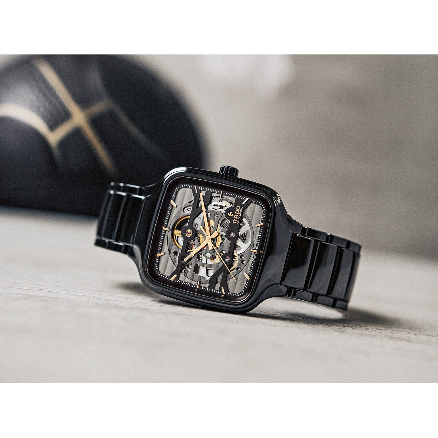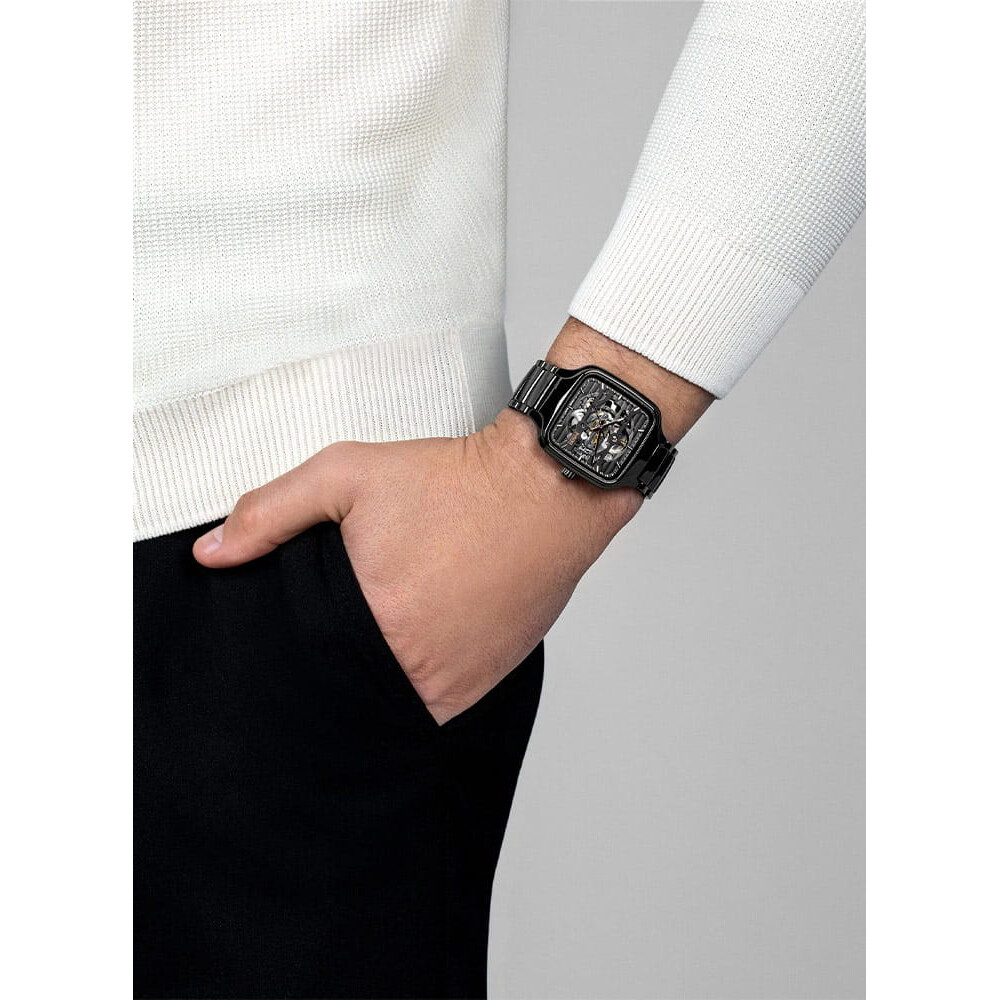 Mostek i płyta górna ze zdobieniem Côtes de Genève odznaczają się powłoką o barwie antracytu. Za sprawą jednoczęściowej koperty typu monobloc o średnicy 38 mm i bransolety z czarnej, polerowanej ceramiki high-tech zegarek kwadratowy Rado R27124162 przedstawia wyróżniające cechy marki Rado w szczególnej formie. Automatyczny zegarek z widocznym mechanizmem Rado True Square Skeleton w kultowym kwadratowym kształcie wzmacnia wspaniały przykład „sztuki szkieletowania”. Zegarek szkieletowy Rado jest dostarczany na zaawansowanej technologicznie ceramicznej bransolecie z tytanowym zapięciem motylkowym. Bransoleta z hipoalergicznej ceramiki high-tech zapewnia wyjątkowy komfort dla skóry i luksusowe doświadczenia wzrokowe.