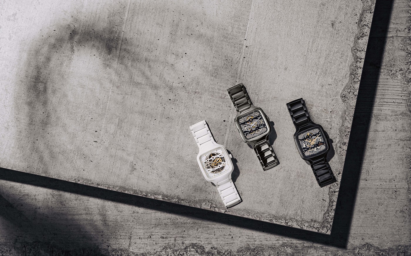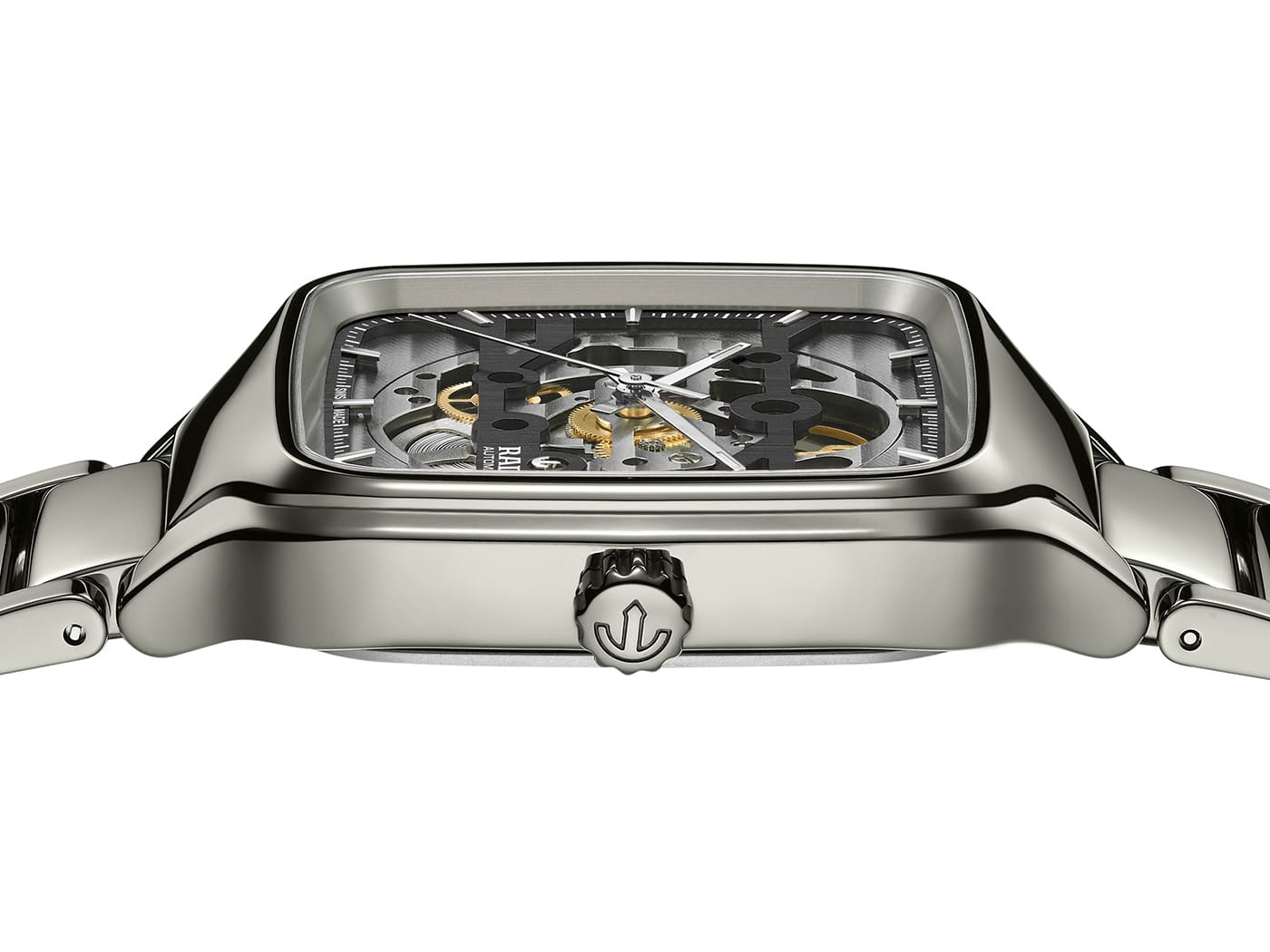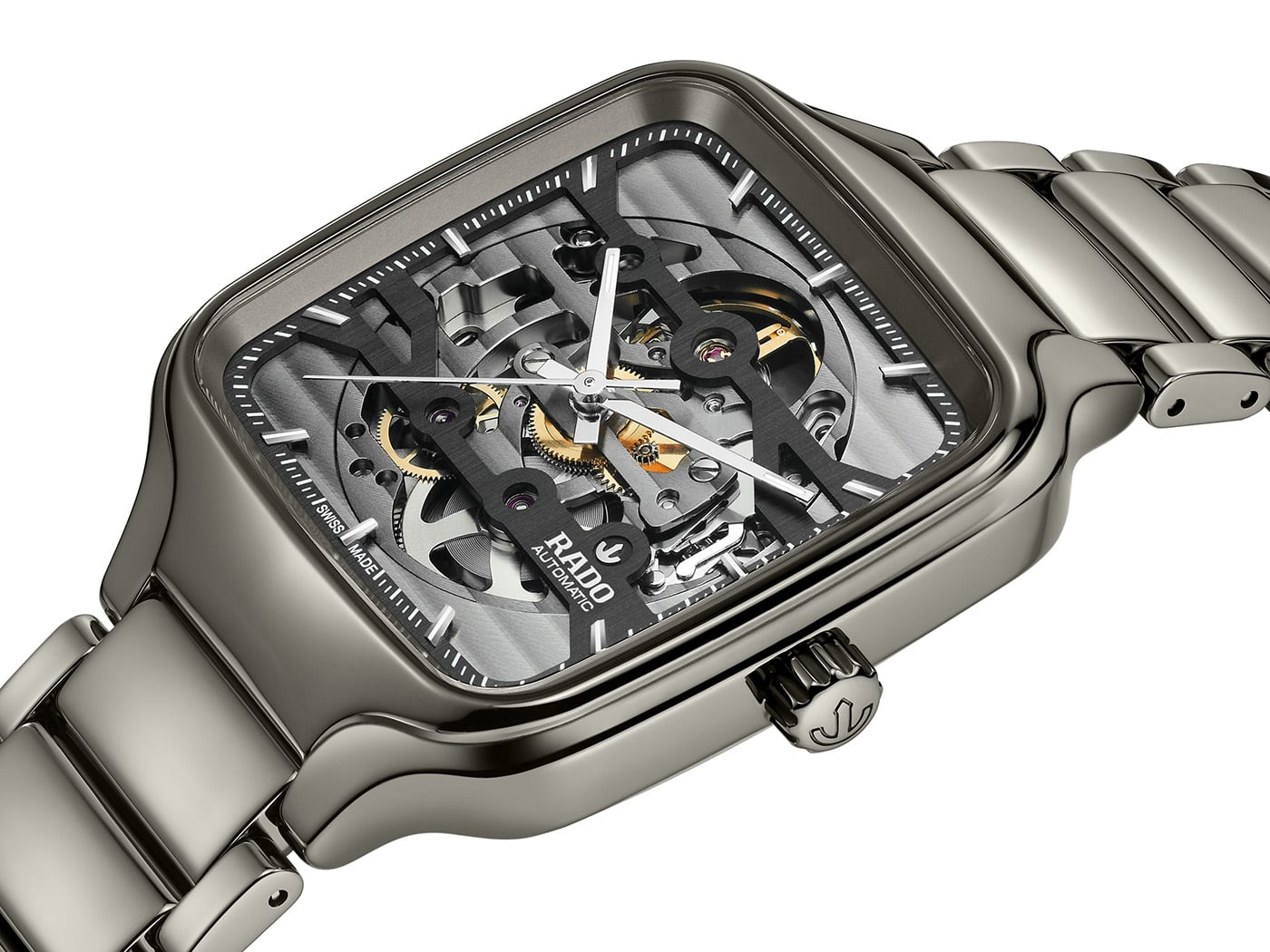 Mostek i płyta górna ze zdobieniem Côtes de Genève odznaczają się powłoką o barwie antracytu. Za sprawą jednoczęściowej koperty typu monobloc o średnicy 38 mm i bransolety z szarej, polerowanej ceramiki plazmowej high-tech zegarek kwadratowy Rado R27125152 przedstawia wyróżniające cechy marki Rado w szczególnej formie. Automatyczny zegarek z widocznym mechanizmem Rado True Square Skeleton w kultowym kwadratowym kształcie wzmacnia wspaniały przykład „sztuki szkieletowania”. Zegarek szkieletowy Rado jest dostarczany na zaawansowanej technologicznie ceramicznej bransolecie z tytanowym zapięciem motylkowym. Bransoleta z hipoalergicznej ceramiki high-tech zapewnia wyjątkowy komfort dla skóry i luksusowe doświadczenia wzrokowe.