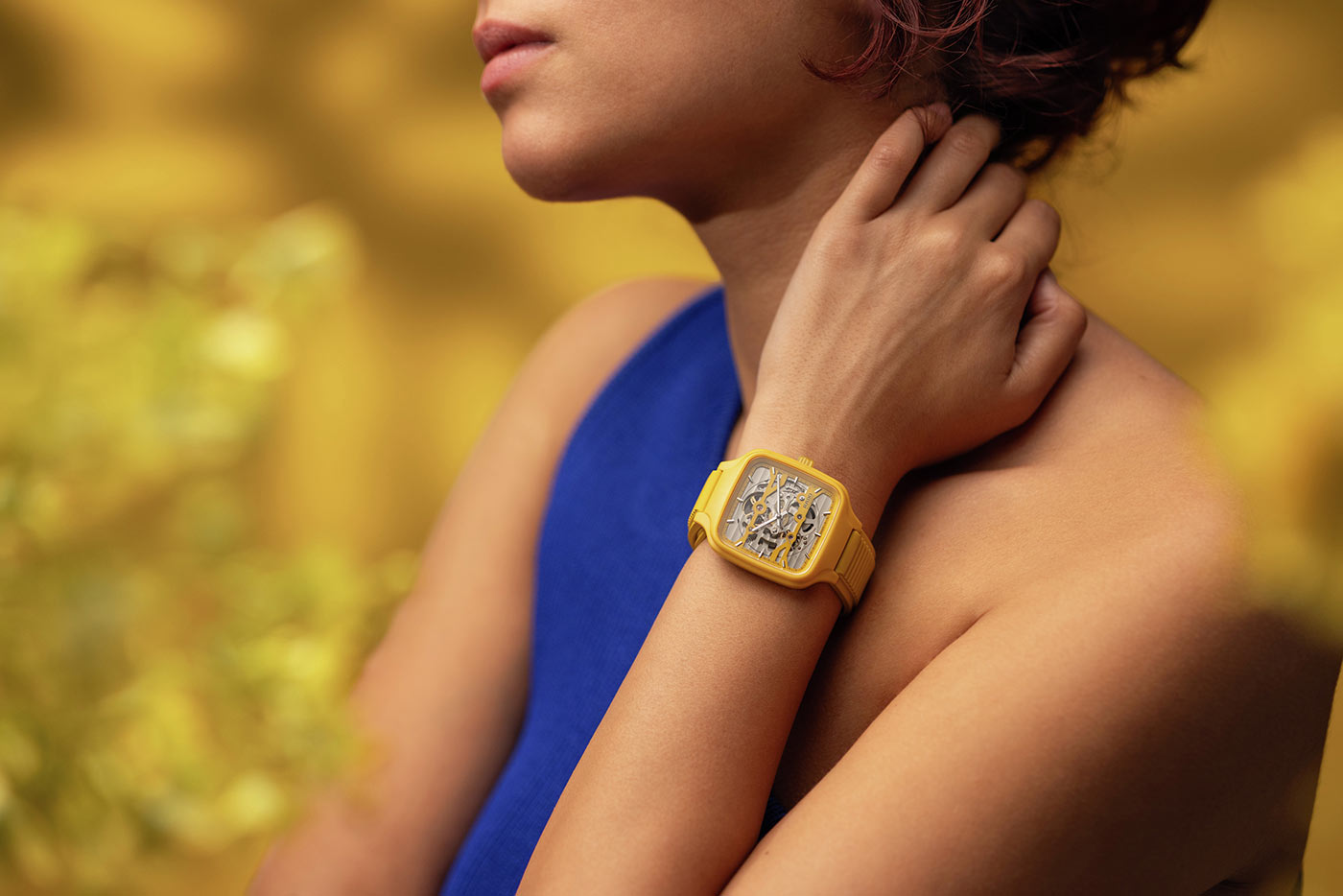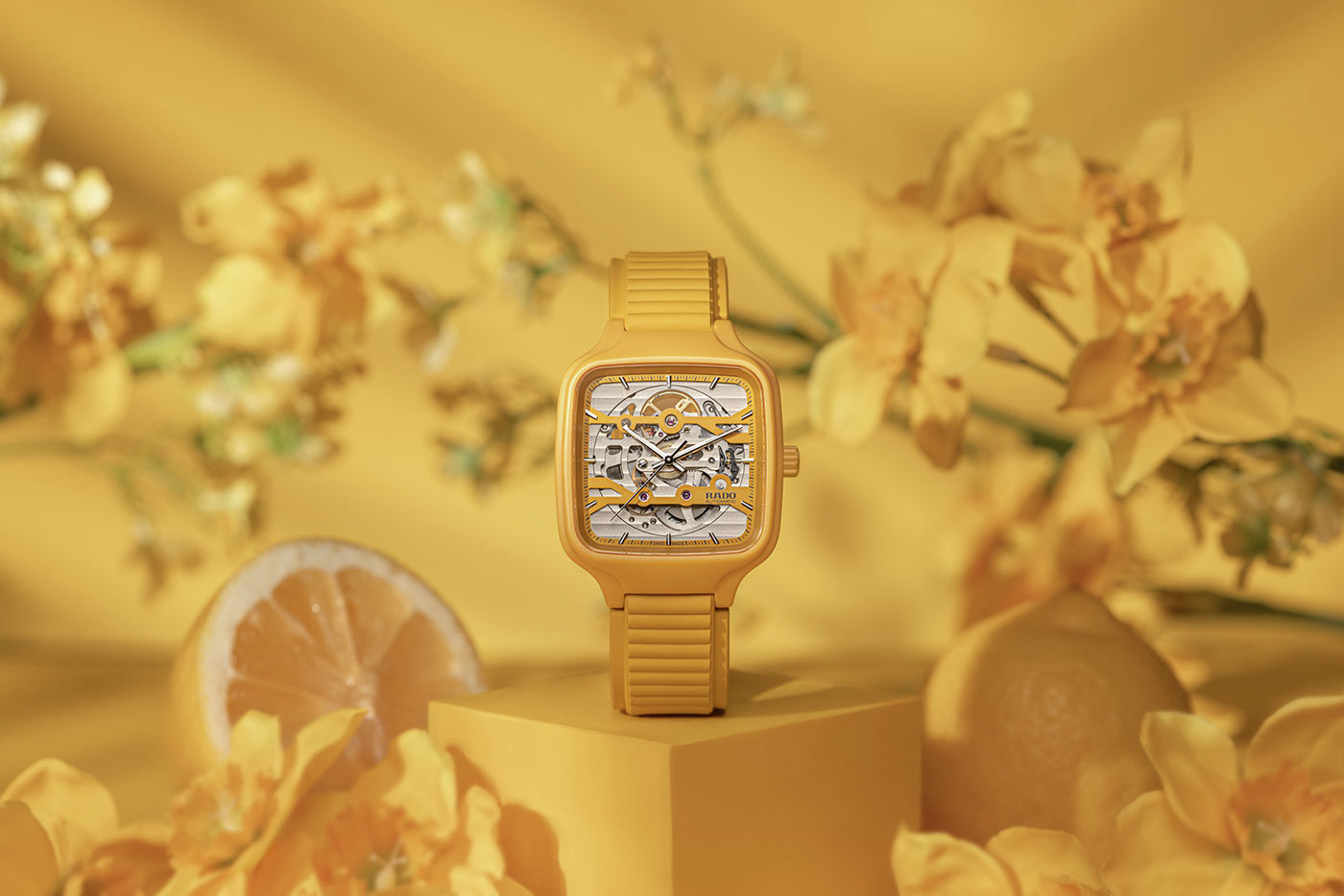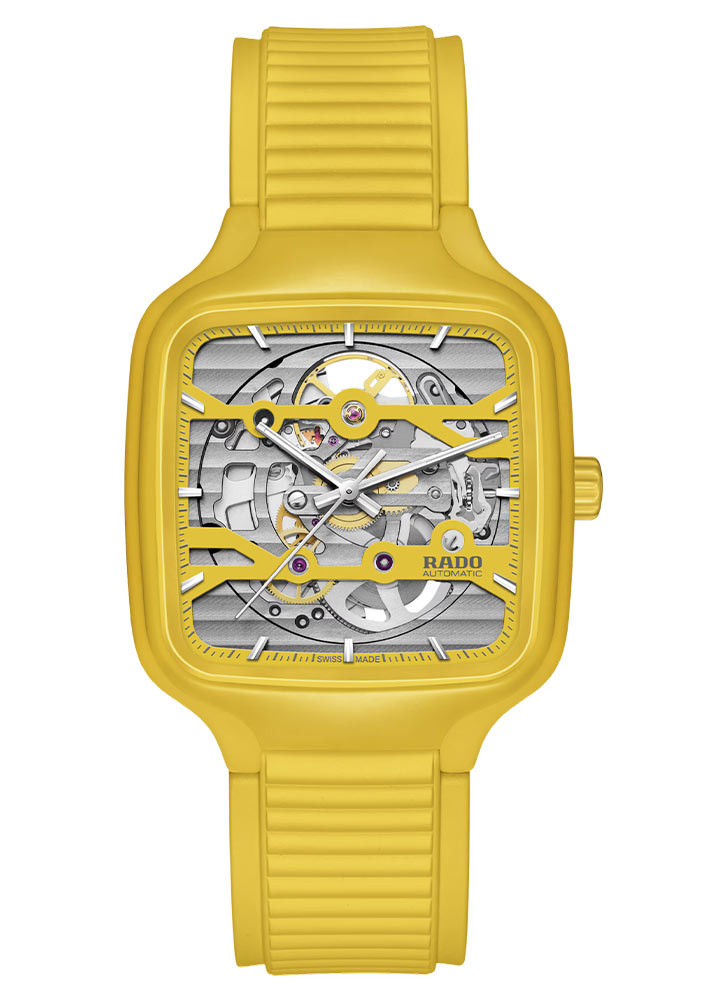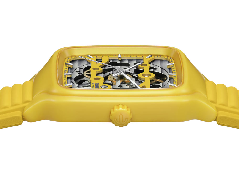 Wykonany z żółtej ceramiki high-tech, ten zegarek zachwyca nie tylko swoim wyglądem, ale także zapewnia niezrównaną trwałość i komfort noszenia. Dzięki właściwościom tego materiału zegarek doskonale dopasowuje się do temperatury ciała, zapewniając nieprzerwaną wygodę. Ceramiczna, kwadratowa koperta monobloc o średnicy 38 mm i elastyczny pasek gumowy tworzą harmonijną całość, która przyciąga spojrzenia. Szwajcarska marka RADO, znana z wykorzystywania najnowocześniejszych technologii, tym razem przekracza granicę konwencji, prezentując zegarek, który nie tylko mierzy czas, lecz także inspiruje do refleksji nad jego płynnością.