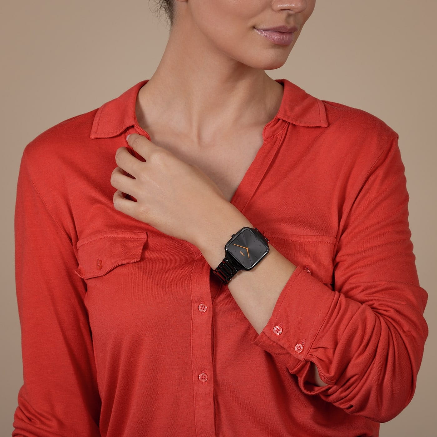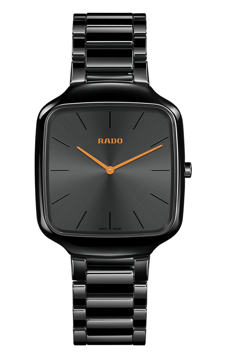 Jednoczęściowa konstrukcja typu monobloc oraz płaskie szkło szafirowe z powłoką antyrefleksyjną podkreślają trwałość i elegancję zegarka, zapewniając komfort noszenia i długowieczność. Tarcza szczotkowana promieniowo „ton w ton” w kolorze czarnym odważnie kontrastuje z lakierowanymi, pomarańczowymi wskazówkami i drukowanym logo Rado, tworząc wyjątkową kompozycję. Polerowana bransoleta z ceramiki high-tech perfekcyjnie uzupełnia spójny, nowoczesny wygląd zegarka. Wodoszczelność do około 30 metrów (3 bary) sprawia, że ten zegarek ceramiczny jest gotowy na każdą sytuację, nawet nagły deszcz.