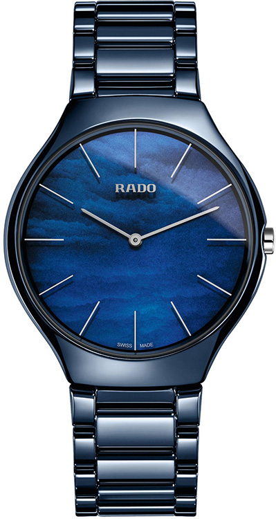 Rado True Thinline Grandi Giardini Italiani R27005902 420.0005.3.090. Grandi Giardini Italiani to sieć ponad 120 ogrodów, które można zwiedzać w 12 regionach włoskich, z dodatkiem kantonu Ticino (Szwajcaria). Sieć obejmuje renesansowe, barokowe i współczesne ogrody: pięćset lat projektowania i historii sztuki ogrodowej i krajobrazowej, unikatowe w skali światowej dziedzictwo artystyczne i botaniczne. Rado jako marka oddana pionierskiemu projektowi, doskonale rozumie znaczenie "dobrze zaprojektowanego doświadczenia". W przypadku tego zegarka, tarcza wykonana z niebieskiej masy perłowej przedstawia wodę. W połączeniu z najwyższej jakości niebieską ceramika, Rado stworzyło niesamowity czasomierz o grubość koperty zaledwie 5 milimetrów. Rado True Thinline wyznacza nowe standardy lekkości i komfortu, stając się jednocześnie najcieńszym zegarkiem ceramicznym świata. Szwajcarscy pionierzy nowoczesnego zegarmistrzostwa, znani z wykorzystania nietypowych, zaawansowanych technologicznie materiałów, by stworzyć to dzieło technologii graniczącej ze sztuką, pokonali niejedną granicę możliwości. Rado True Thinline Quartz łączy w sobie cechy znakomitej wytrzymałości i niespotykanej dotąd wygody użytkowania.