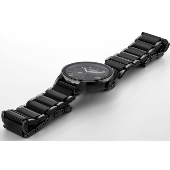 Szwajcarski mechanizm kwarcowy został zamknięty w kopercie o średnicy 30 mm, wykonanej z polerowanej stali szlachetnej. Tarcza w odcieniu głębokiej czerni przyciąga wzrok delikatnym giloszowaniem i perfekcyjnie rozmieszczonymi indeksami, a praktyczny datownik na godz. 3 zwiększa jej użyteczność. Całość chroni szkło szafirowe – twarde, odporne na zarysowania i niemal całkowicie przejrzyste. Bransoleta to połączenie stalowych boków z ogniwami wykonanymi z ceramiki high-tech, która nie tylko wygląda elegancko, ale też zapewnia wyjątkowy komfort termiczny i hipoalergiczność.
