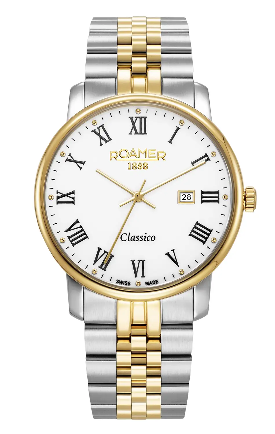 Zegarek męski Roamer Classico Gents 971856 48 25 50 to kwintesencja klasycznej elegancji, zamknięta w prostej, ponadczasowej formie. Minimalistyczna biała tarcza z rzymskim indeksami, przywołuje ducha tradycyjnego zegarmistrzostwa, a smukła koperta w rozmiarze 40 mm ze stali szlachetnej w połączeniu ze stalową bransoletą bicolor sprawia, że model ten doskonale wpisuje się w styl smart classic – dyskretny, ale zauważalny. Prezentowany model wzbogacony jest o pozłacane elementy, bezel koperty oraz środkowe ogniwa bransolety pokryte są złotą powłoką IP. Roamer to czasomierz dla mężczyzny, który nie potrzebuje ekstrawagancji, by wyrazić pewność siebie. Wybór świadomy, elegancki, lojalny wobec tradycji, ale gotowy na codzienność współczesnego świata.
