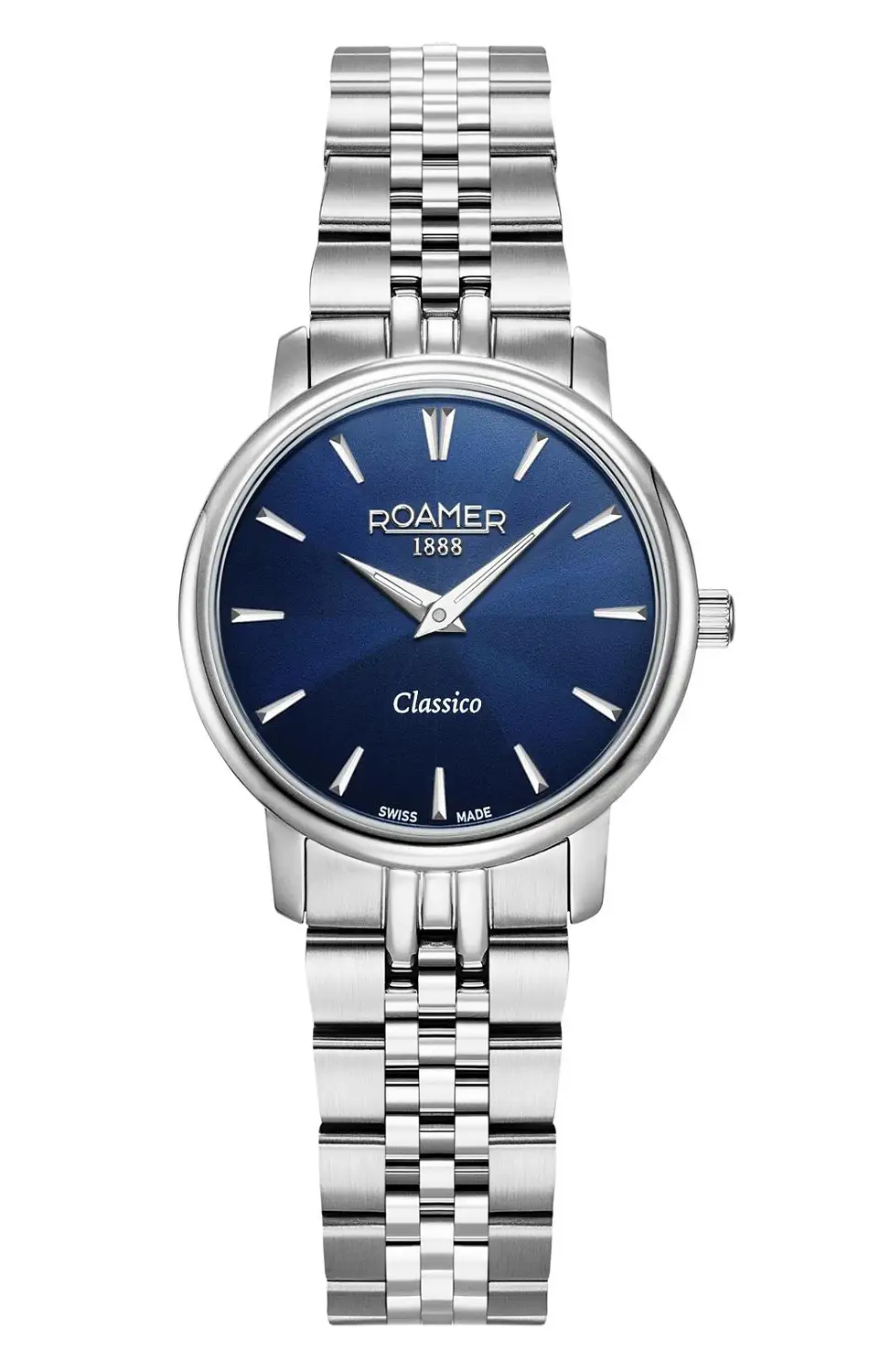 Zegarek damski Roamer Classico Ladies 971857 41 45 50 - elegancja, która nie potrzebuje rozgłosu. Ten zegarek powstał z myślą o kobietach, które siłę wyrażają subtelnością. Smukła forma, niebieska tarcza oraz jej indeksy przywołują ducha tradycyjnego zegarmistrzostwa, ale w wersji dostosowanej do tempa współczesnego życia – uporządkowanego, świadomego i pięknego w prostocie. Koperta w kobiecym rozmiarze 30 mm zestawiona jest ze stalowej bransolety, która zagwarantuje wygodne i bezpieczne użytkowanie.