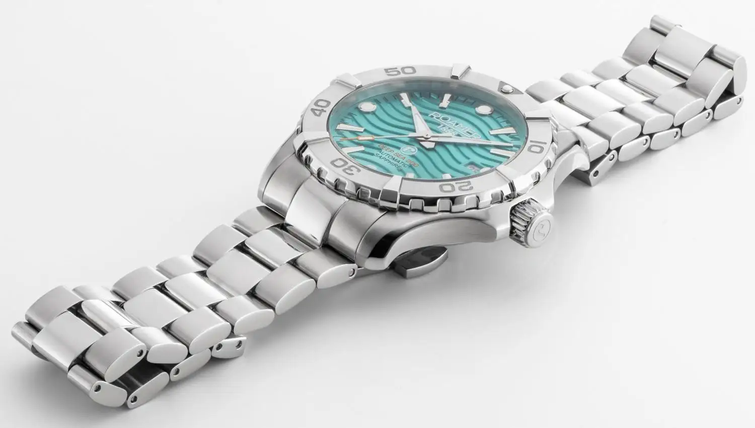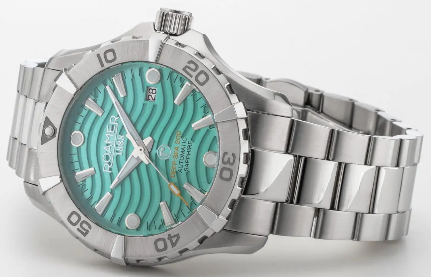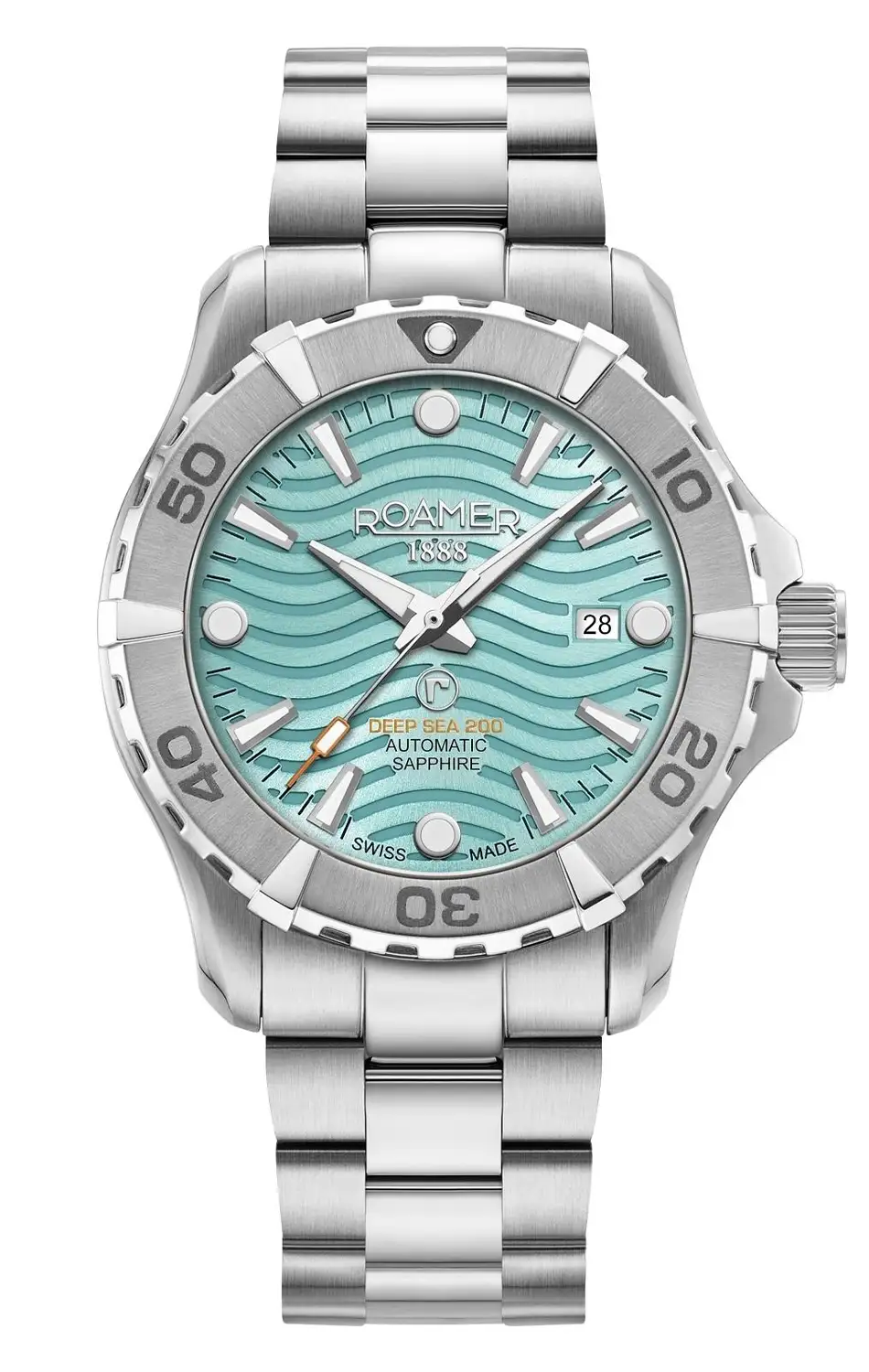 Nurkowy zegarek męski Roamer Deep Sea 200 Automatic 860983 41 05 70 to model, który łączy funkcjonalność czasomierza narzędziowego z nowoczesną, stylową formą. Zintegrowana bransoleta, masywna koperta i turkusowa tarcza z wytłoczonym wzorem fal budują design, który nie tylko przyciąga wzrok, ale też budzi zaufanie. Szkło szafirowe chroni tarczę przed zarysowaniami, a bransoleta z pełnych ogniw została zakończona bezpiecznym zapięciem motylkowym.